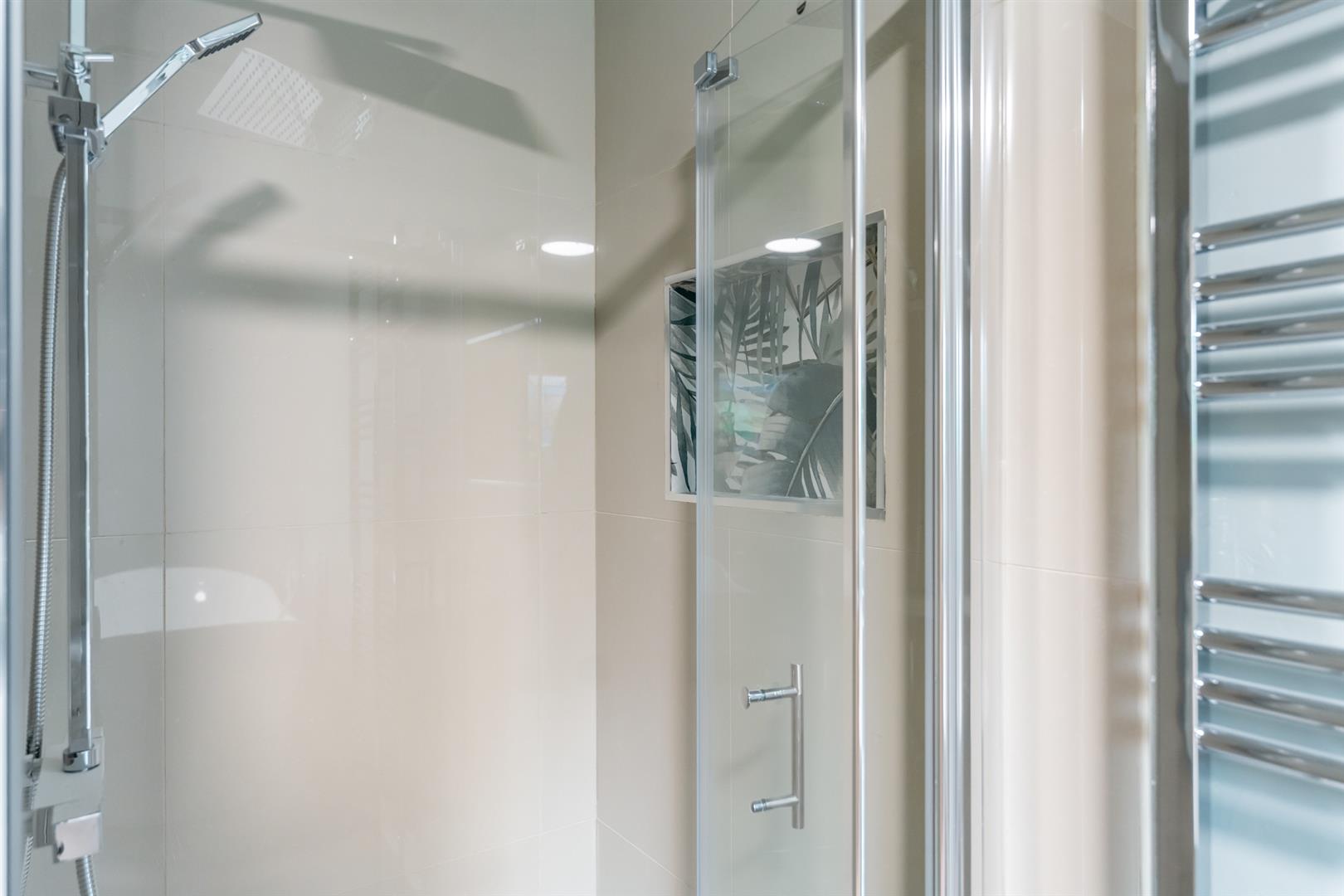 Modern white suite comprising shower enclosure with pivot glass doors and overhead rainfall shower, vanity unit with mixer tap, tiled splashback and storage, low flush w/c, wall mounted radiator, extractor fan, Velux window, wood effect LVT flooring.