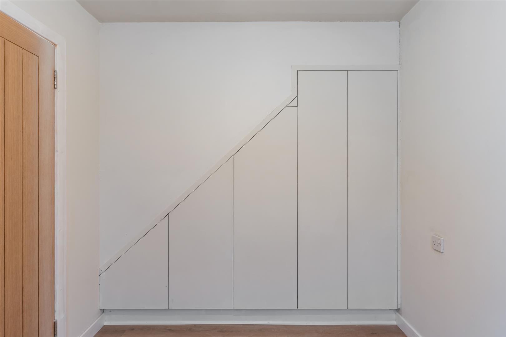 Plumbed for washing machine, space for tumble dryer, up and over door with power and light.