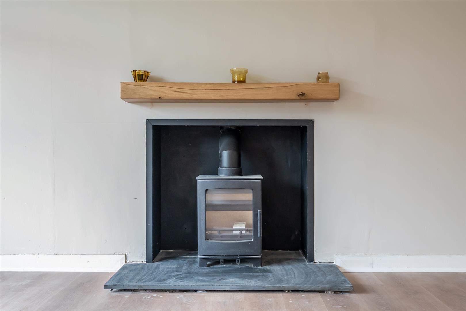 Wood burning stove with tiled heart and wooden mantle, wood effect LVT flooring.