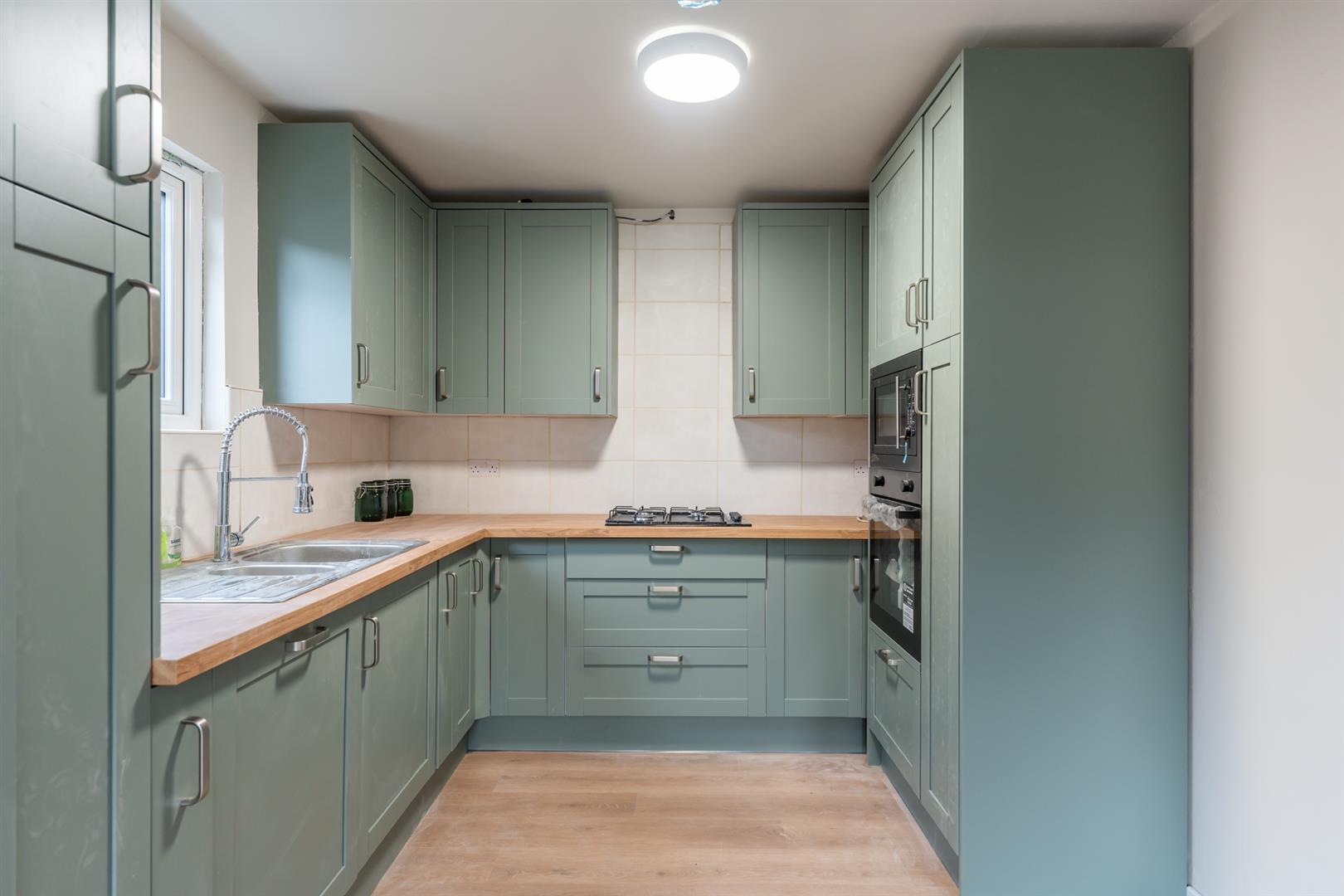 Modern range of high and low level units, wood laminate worktops, inset stainless sink unit with with mixer tap and built in drainer, integrated dishwasher, integrated four ring gas hob, mid-level oven and microwave, space for fridge freezer, wood effect LVT flooring, larder cupboard.