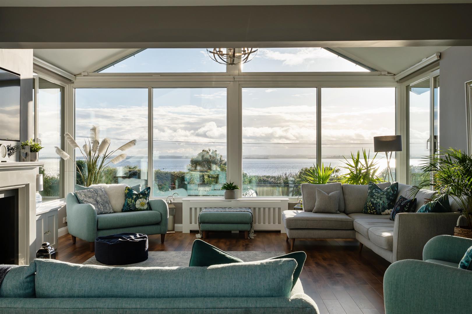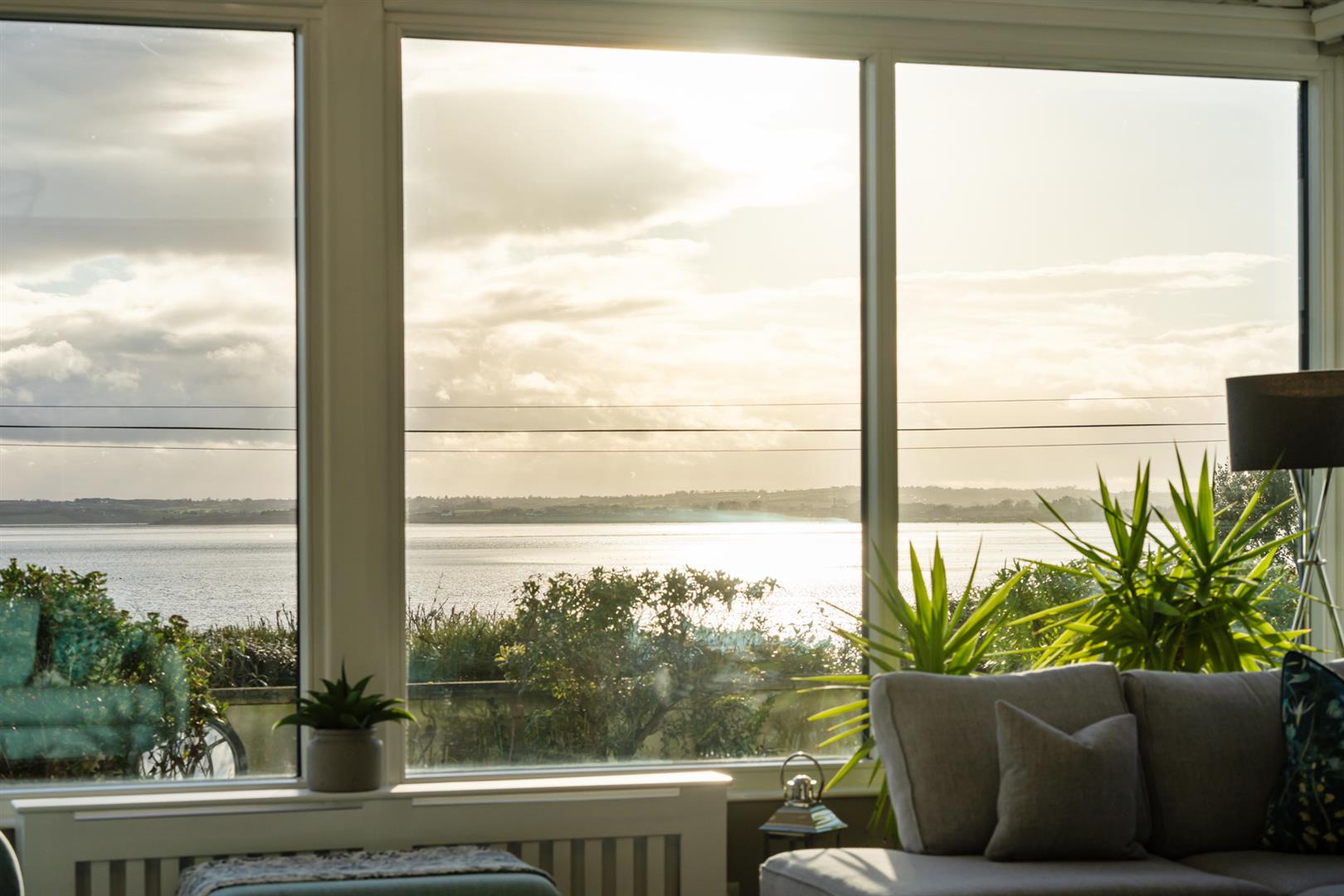 The home has been crafted to a high specification throughout, enhanced by oil-fired central heating, solar panels and triple-glazed windows with powder-coated aluminium exteriors and timber interiors. A welcoming entrance porch with tiled floor and built-in robes leads to a bright hall with generous storage and a contemporary cloakroom. Double doors open into a dramatic vaulted lounge where an apex corner window frames uninterrupted lough views, complemented by a granite fireplace with gas stove.