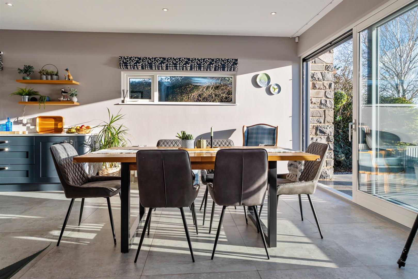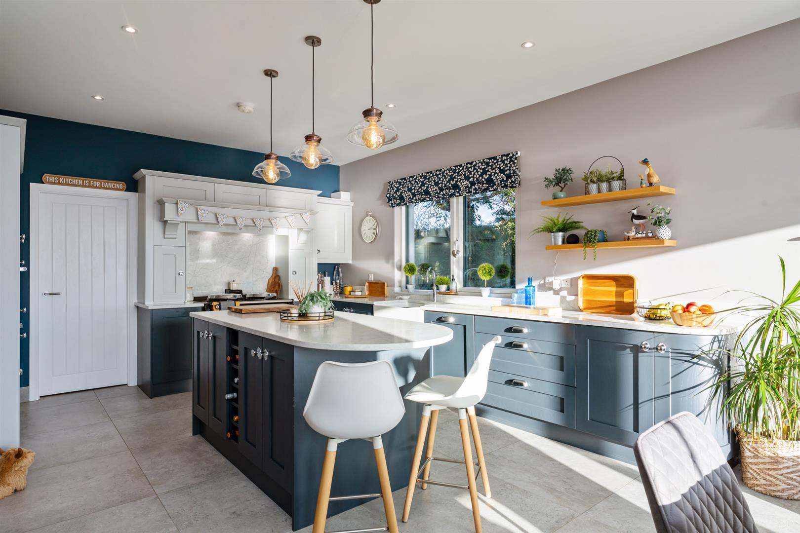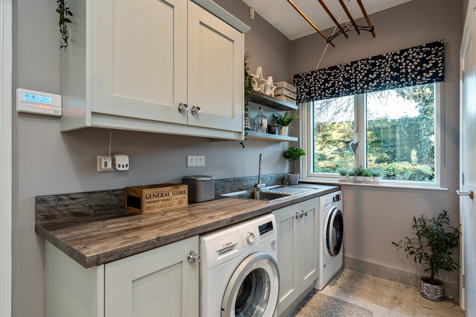 The luxurious kitchen includes quartz work surfaces, a central island with wine rack, integrated appliances and converted electric Aga, flowing into a dual-aspect dining room with gas fire and large sliding patio doors to the garden. A spacious utility room provides extensive storage, a walk-in pantry and laundry facilities.