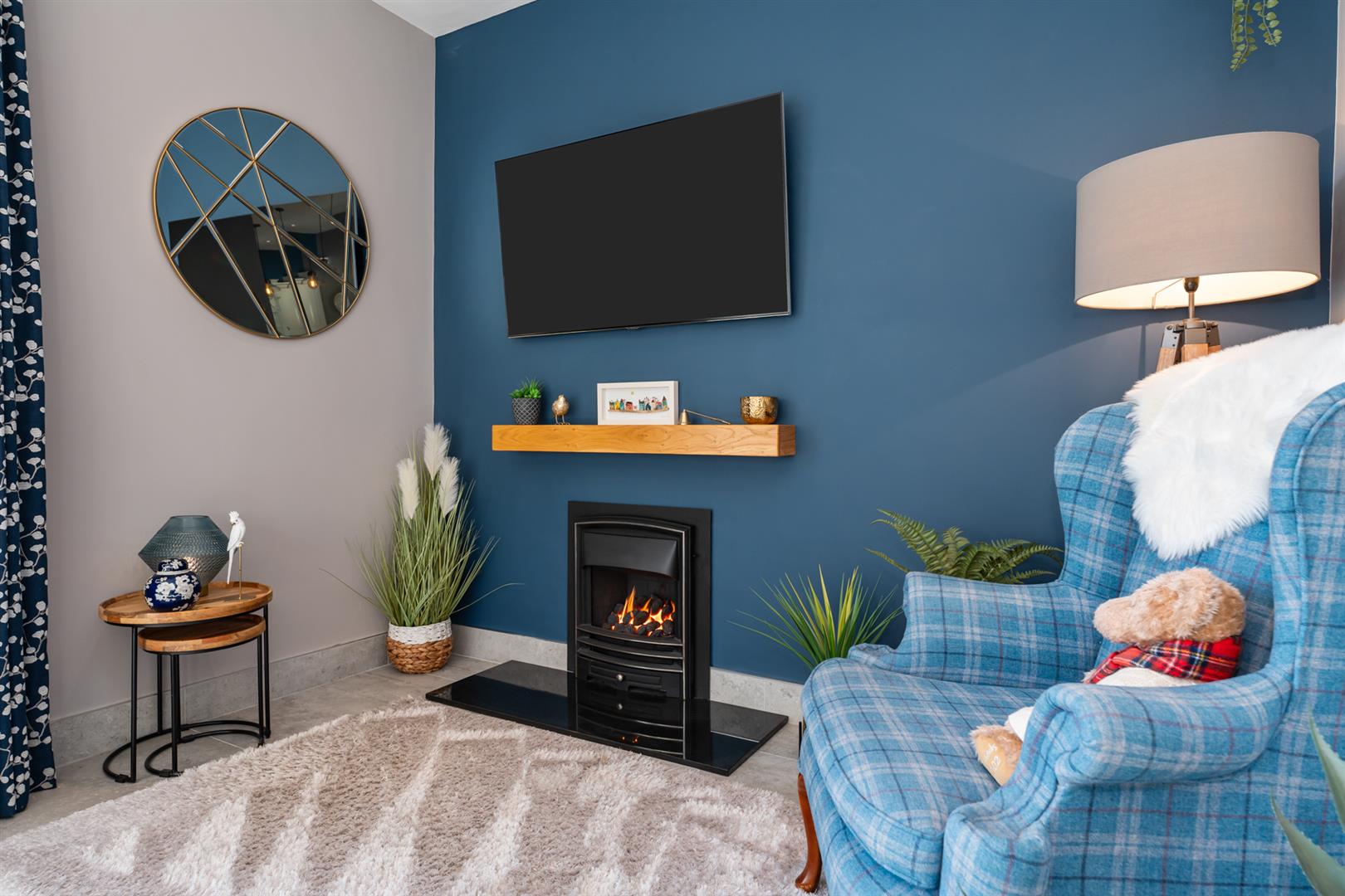 Hole in wall feature fireplace with Gas fire and granite hearth. Ceramic tiled floor. Large sliding patio doors with double glazed windows to patio garden.