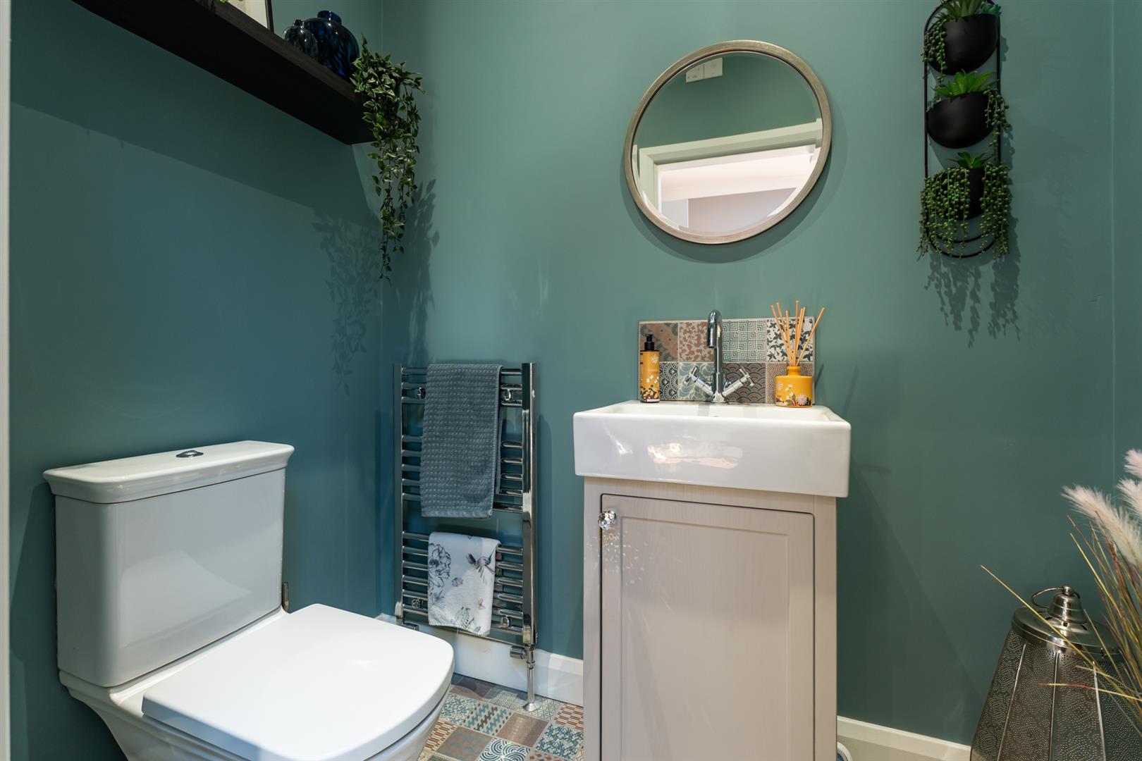 Modern white suite comprising vanity unit with mixer tap, tiled splashback, low flush wc, feature chrome wall mounted radiator, tiled floor, recessed spotlighting and extractor fan.