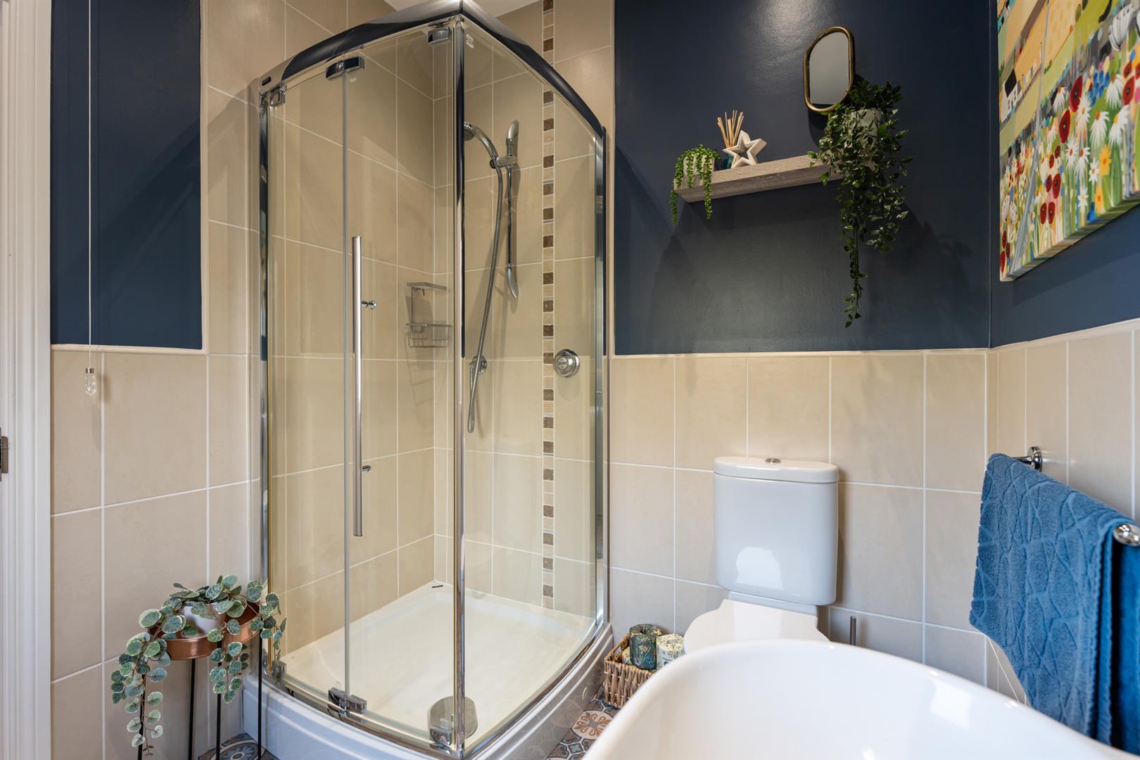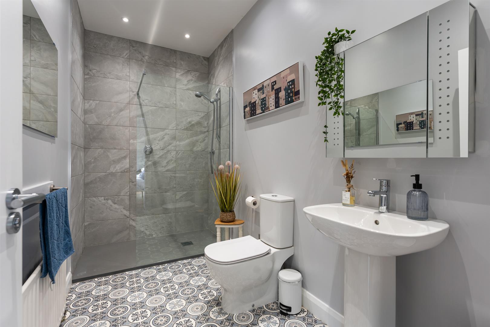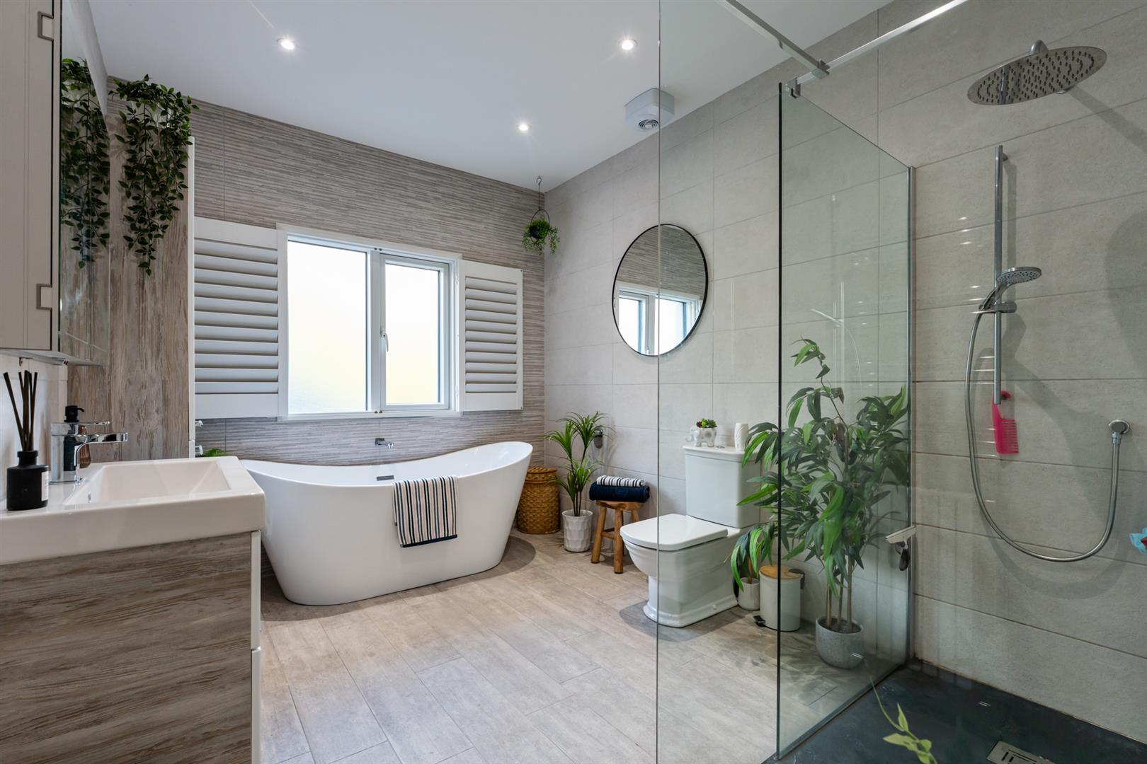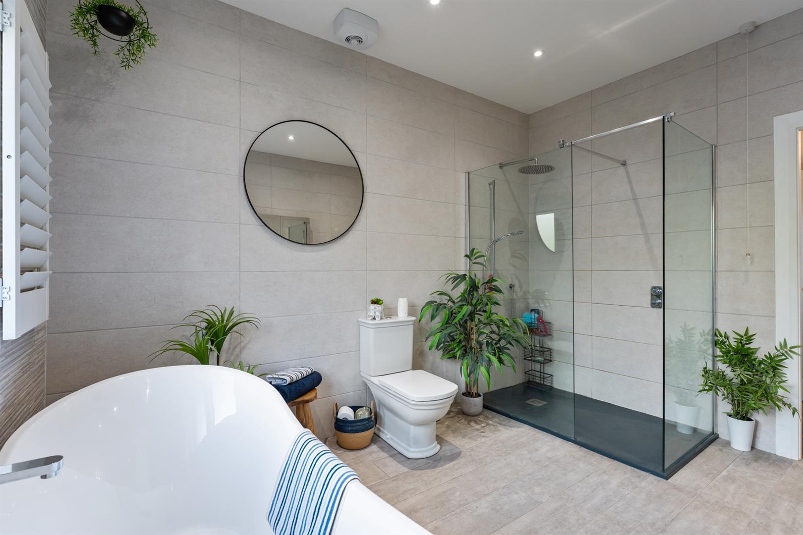 Luxury white suite comprising free standing bath with mixer tap, large walk in shower cubicle with shower screen, rainfall shower head and hand shower attachment, vanity unit with mixer tap, mirror cabinet, low flush wc, built in cupboard, ceramic tiled floor, recessed spotlighting, extractor fan and feature chrome wall mounted radiator.