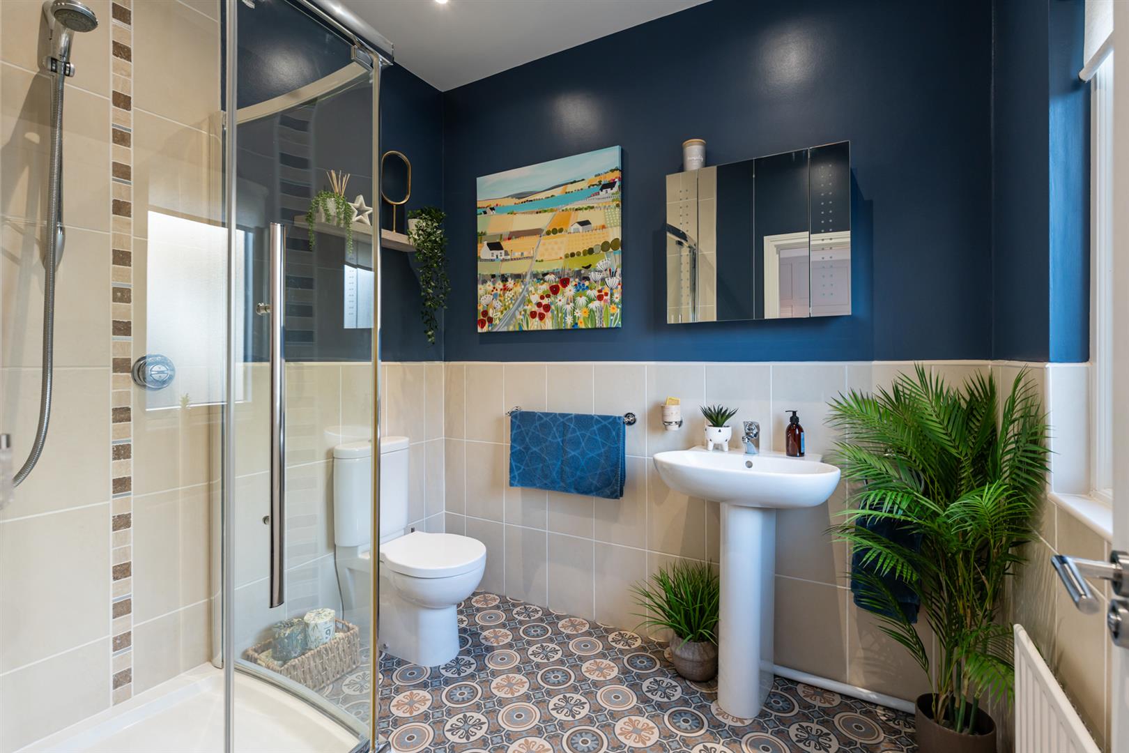 White suite comprising large shower cubicle with overhead shower, tiled walls and shower screen and sliding shower doors, pedestal wash hand basin with mixer taps, mirror cabinet, low flush wc, recessed spotlighting and extractor fan.