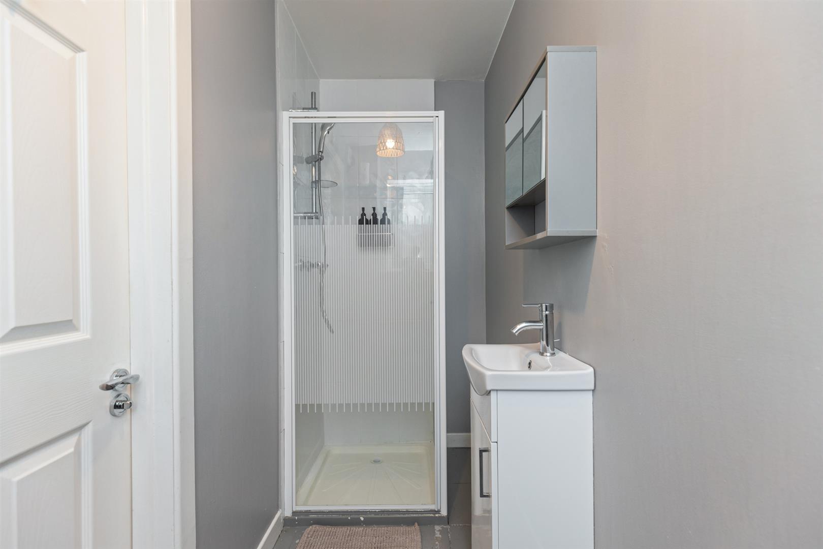 White suite comprising enclosed shower unit with wall mounted overhead shower and glass door, pedestal wash hand basin with mixer tap and tiled splashback, extractor fan, tiled floor and partially tiled walls.