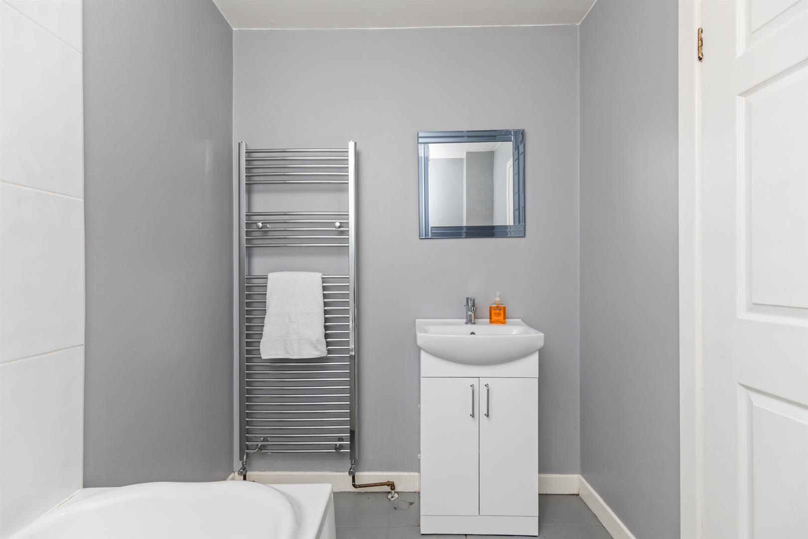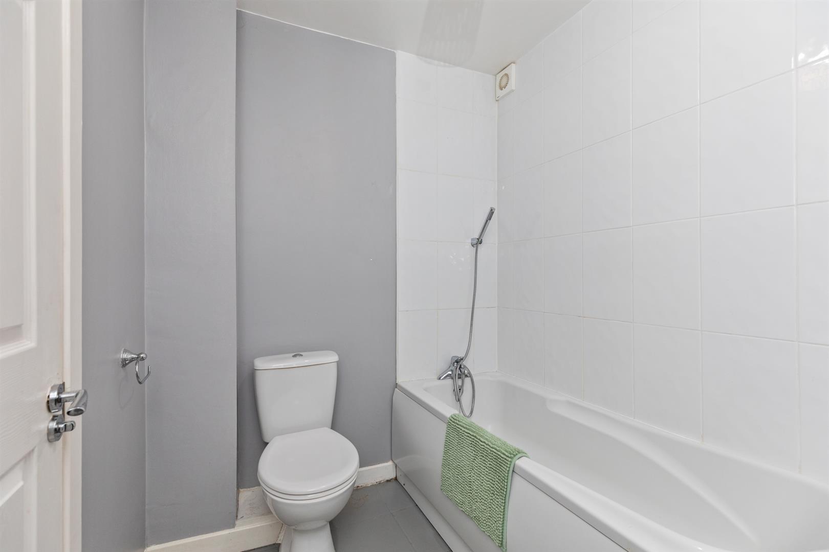 White suite comprising, panelled bath with mixer tap, handheld shower attachment, low flush w/c, pedestal basin with mixer tap and tile splashback, extractor fan and tiled floor.