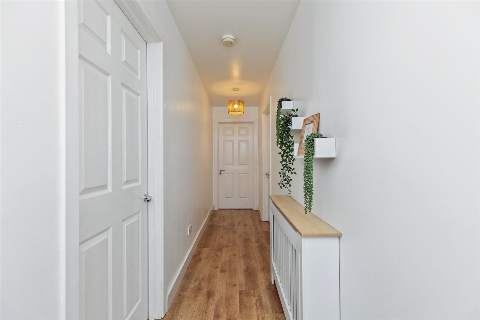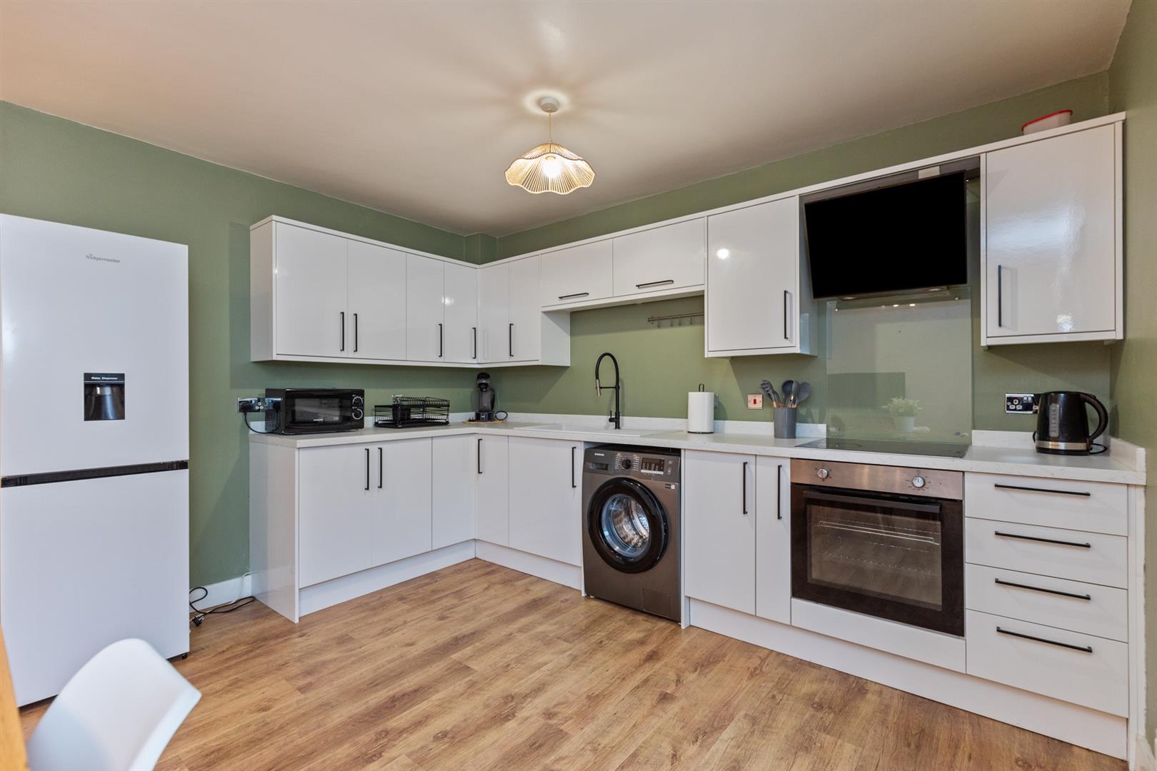 Modern range of high and low level units, laminate work surfaces, inset ceramic sink with mixer tap, four ring electric hob, integrated oven, angled extractor hood, space for fridge/freezer, plumbed for washing machine and wood laminate floor.