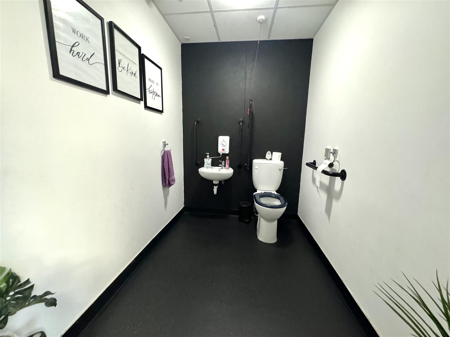 The space offers a well-planned layout that includes a large reception space, one private changing room, a separate kitchen area, and a dedicated toilet space, providing convenience and functionality for both clients and staff.
