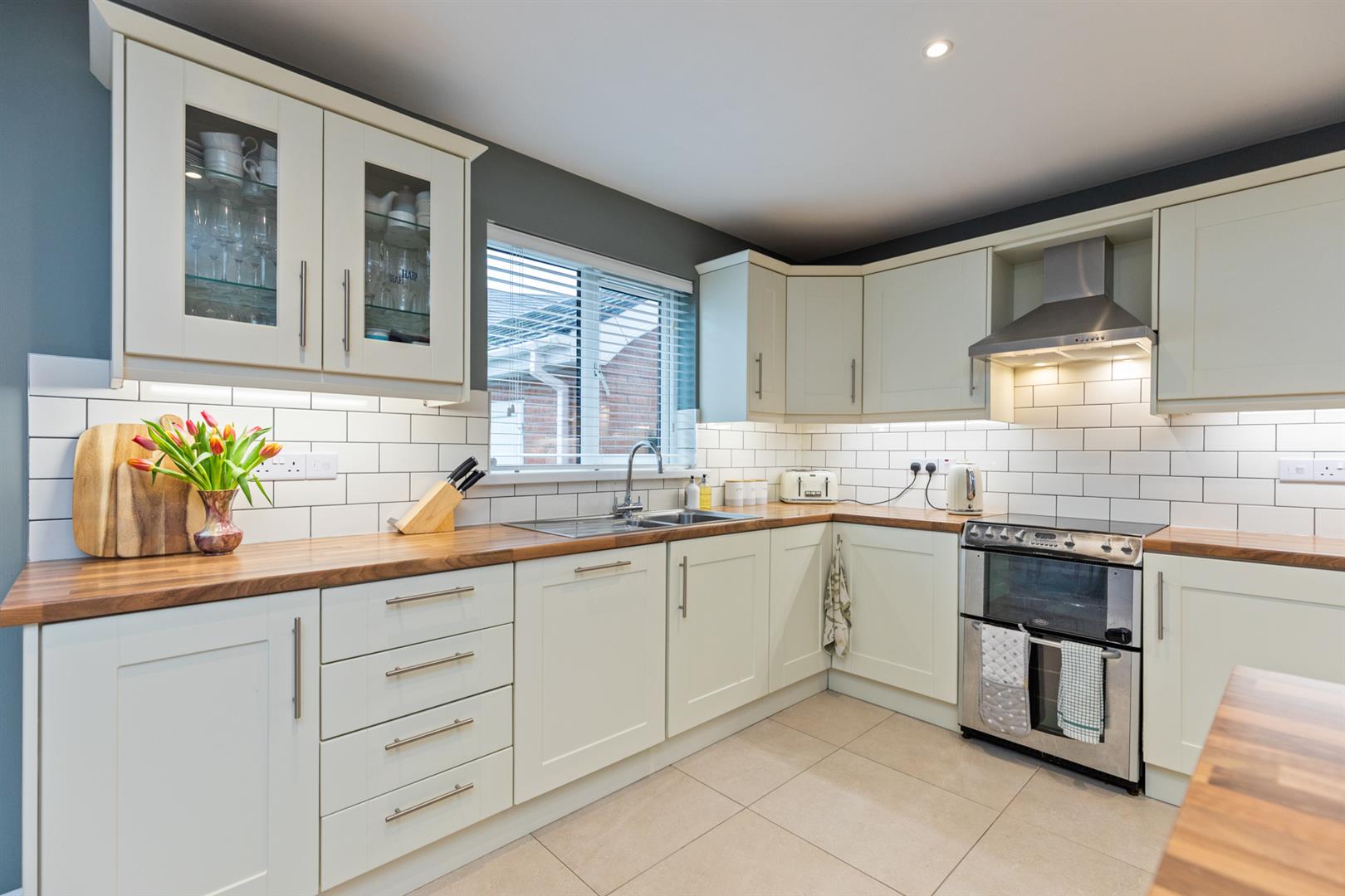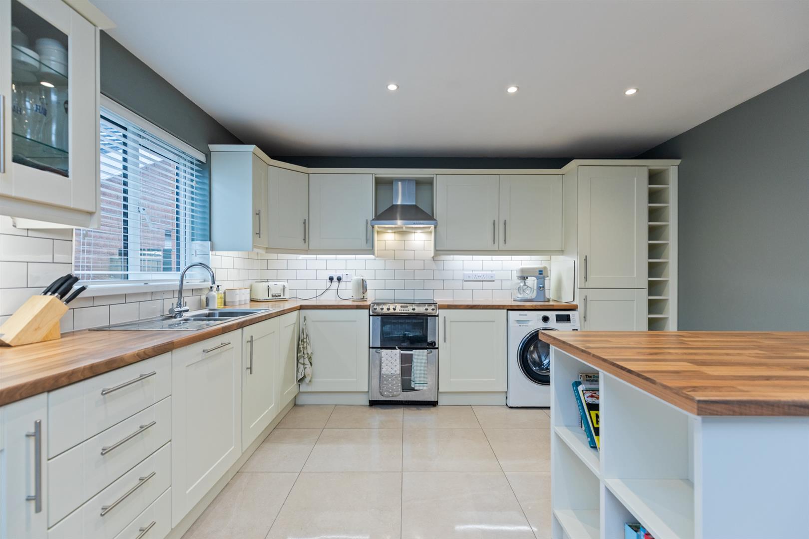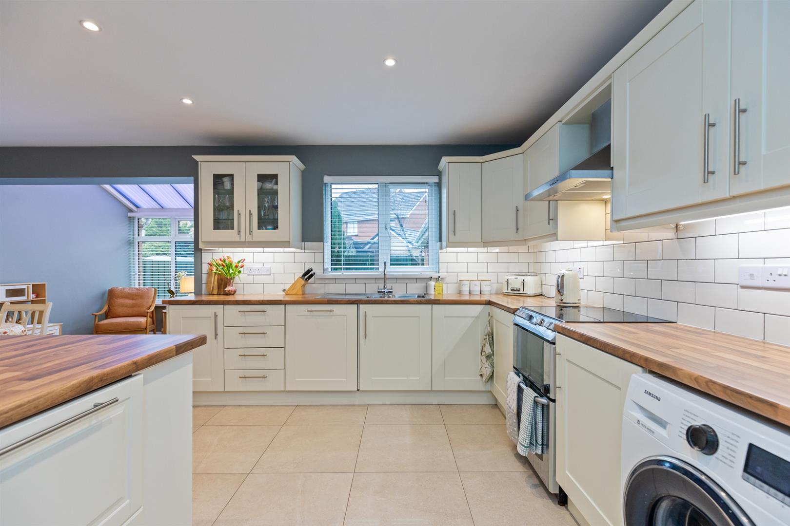 Modern range of high and low level units, wood laminate work surfaces, inset stainless steel sink unit with mixer tap and drainer, integrated appliances to include; dishwasher and fridge freezer, plumbed for washing machine and space for oven, stainless steel extractor fan, tiled flooring, recessed spotlights, space for dining and breakfast bar with seating and storage.