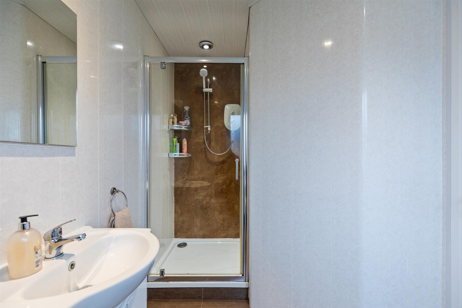 White suite comprising shower enclosure with overhead electric shower and glass door, vanity unit with storage and mixer tap, low flush w/c, recessed spotlights and tiled flooring.