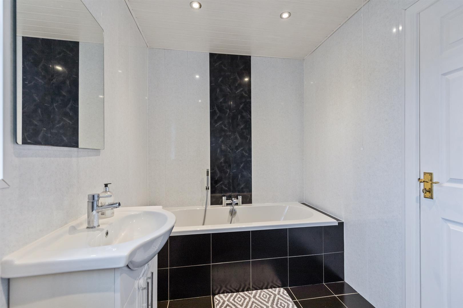 White suite comprising shower enclosure with tiled bath with mixer tap and handheld shower attachment, vanity unit with storage and mixer tap, low flush w/c, recessed spotlights and tiled flooring.