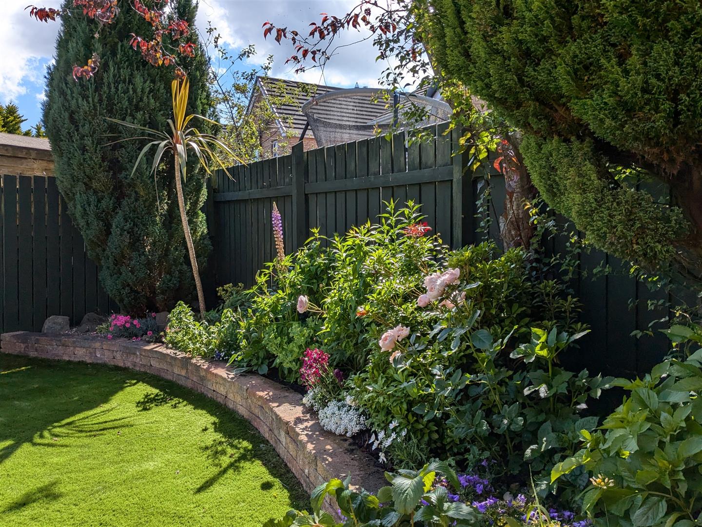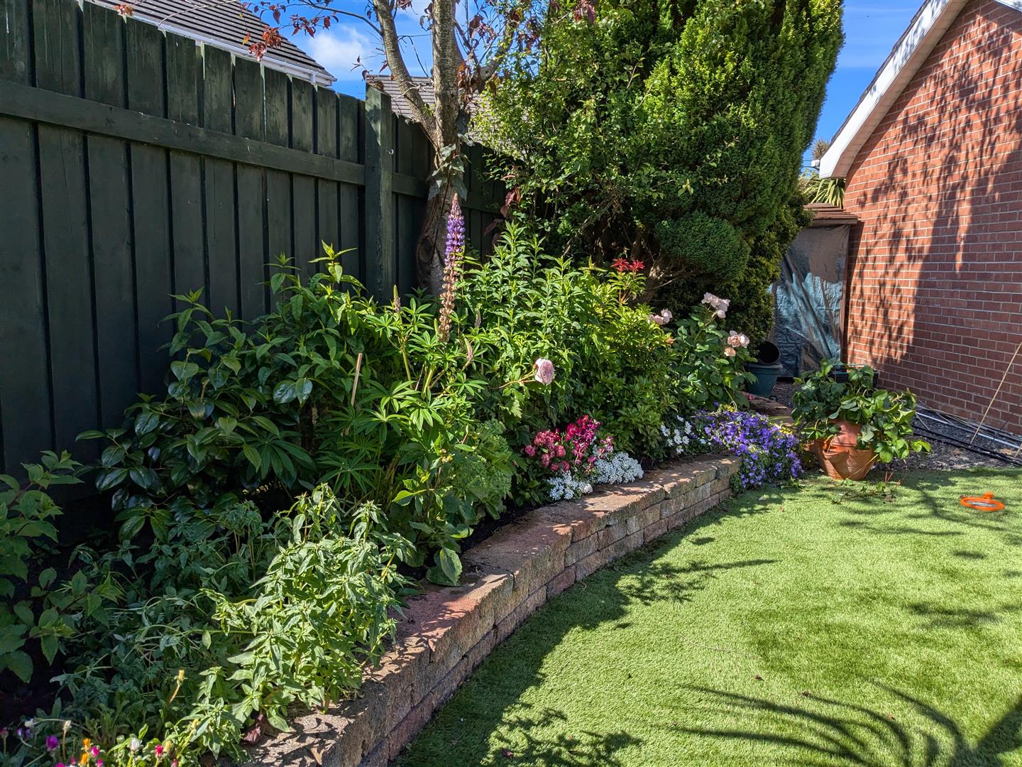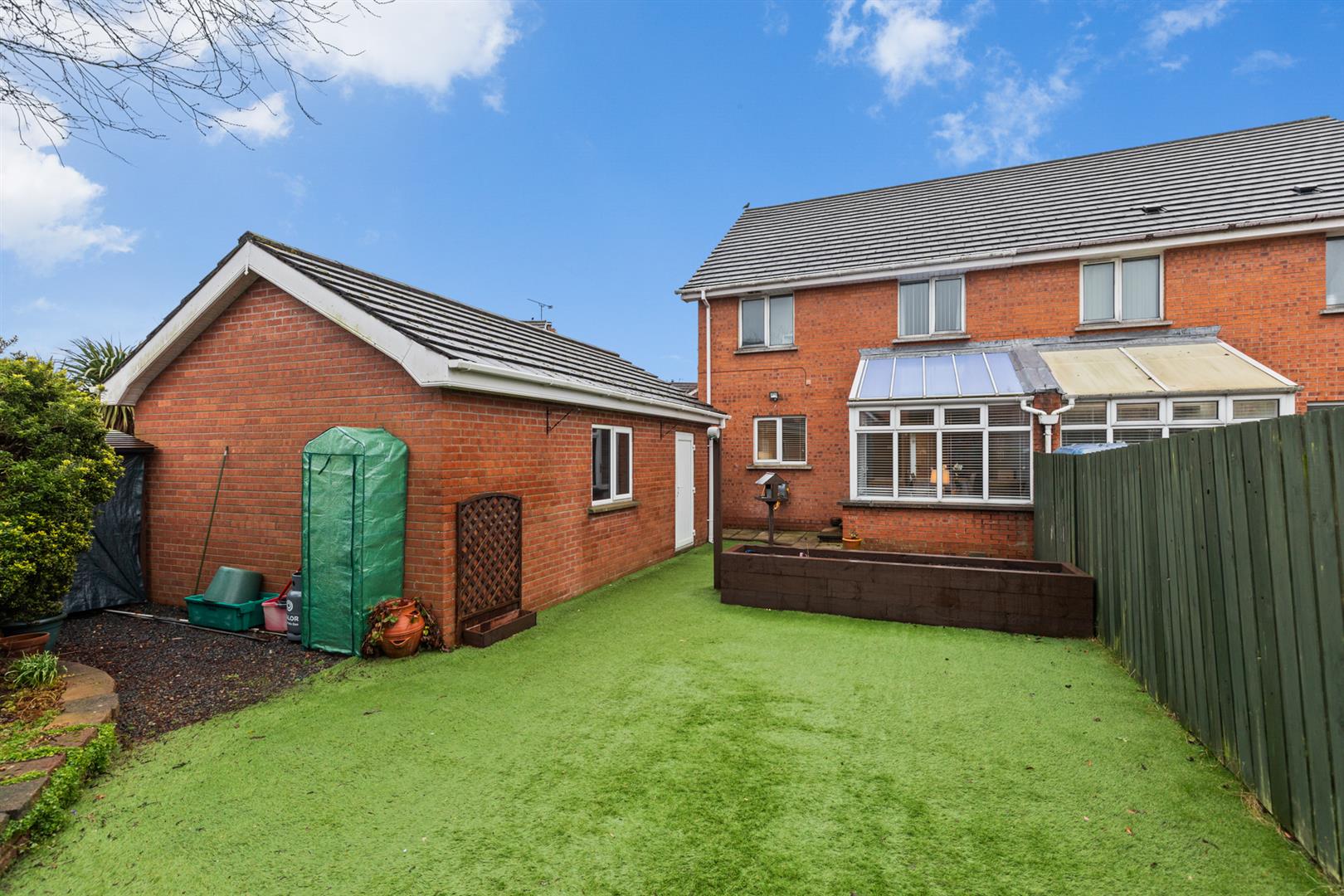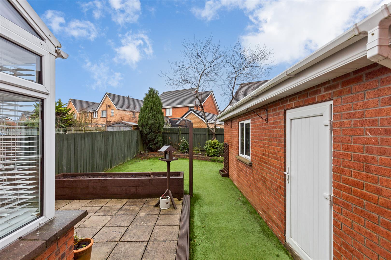 Rear - Enclosed garden with mature trees and plants, artificial lawn, outside tap, outside light, enclosed and West facing garden.
