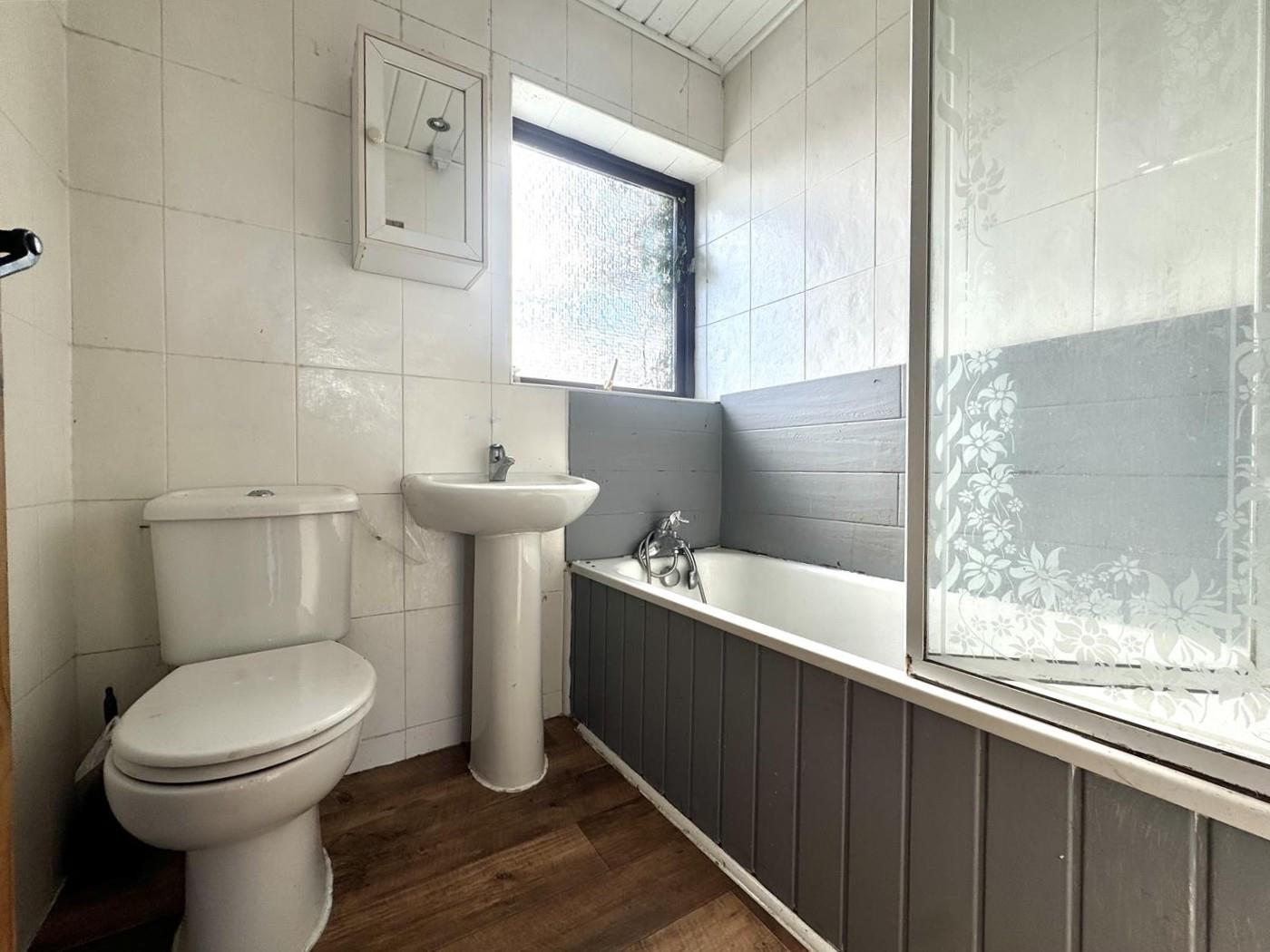 White suite comprising low flush w.c, pedestal wash hand basin with mixer tap, panelled bath with shower head, recessed spotlights, wood laminate flooring.