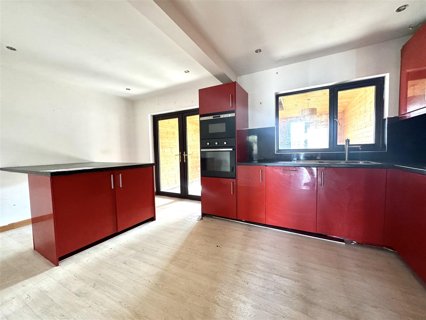 Range of high and low level units, laminate work surfaces, 1 & 1/4 bowl stainless steel sink unit with mixer tap and drainer, integrated double oven and four ring hob, concealed extractor hood, integrated dishwasher, plumbed for washing machine, breakfast peninsula with storage and seating, double doors to sun room.