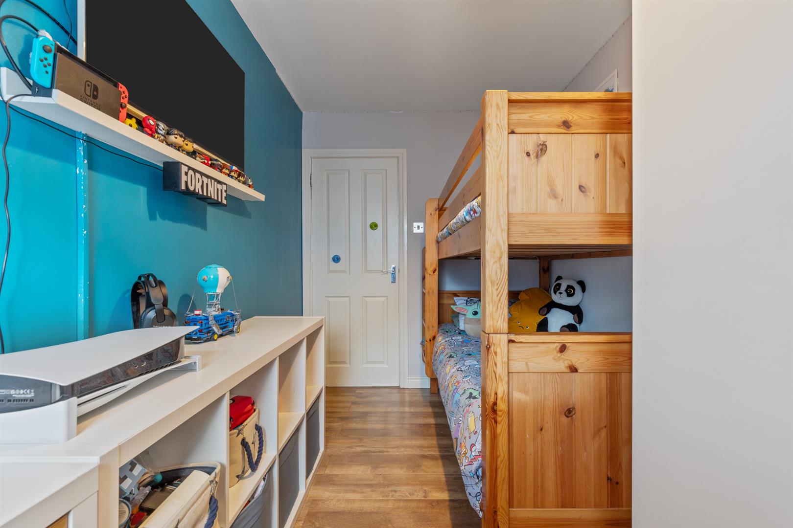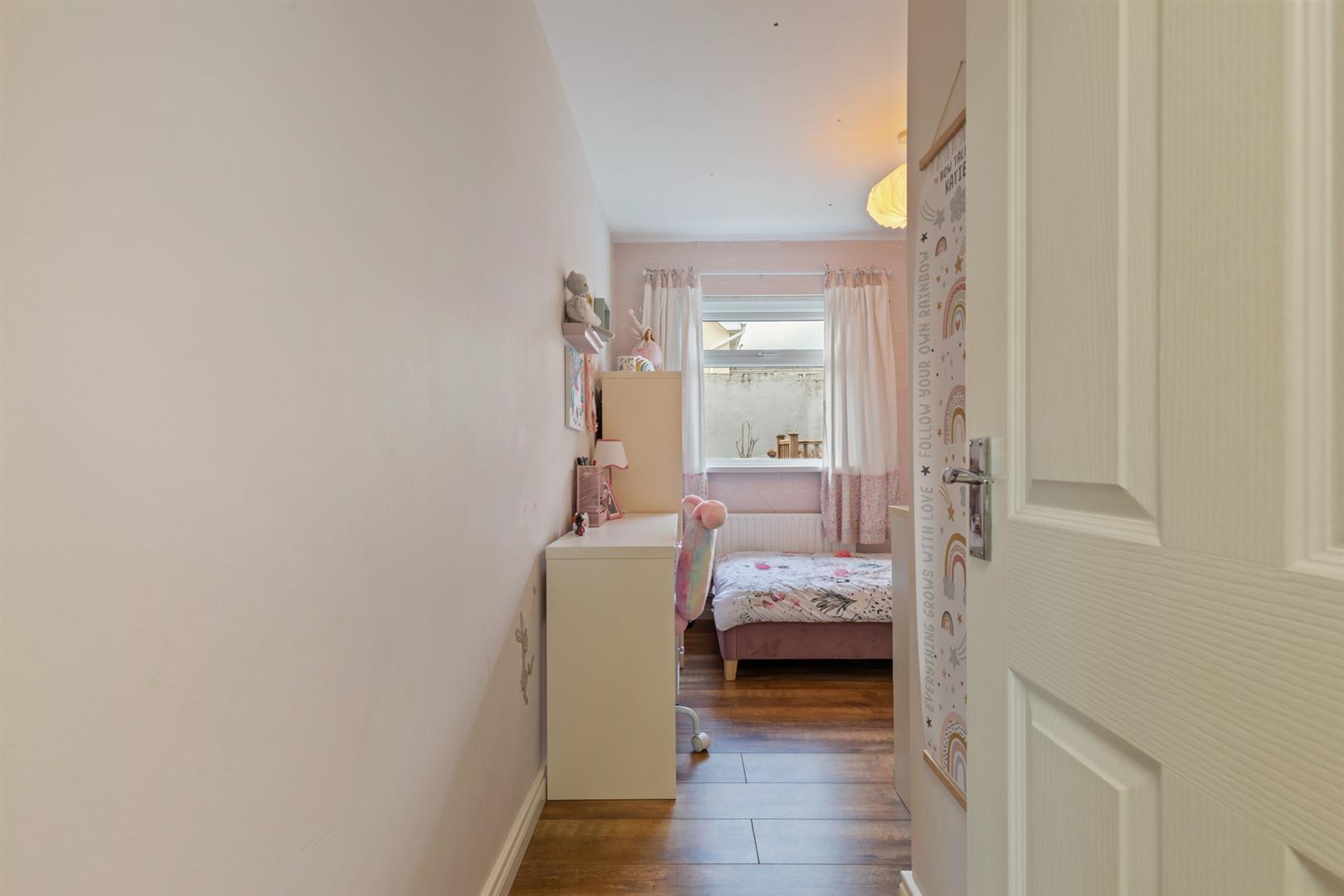 An inner hall provides access to three bedrooms, all finished with wood laminate flooring. The rooms offer flexibility for use as bedrooms, a home office, or study depending on requirements. The bathroom comprises a modern white suite including a panelled bath, electric overhead shower, vanity unit and low flush WC.