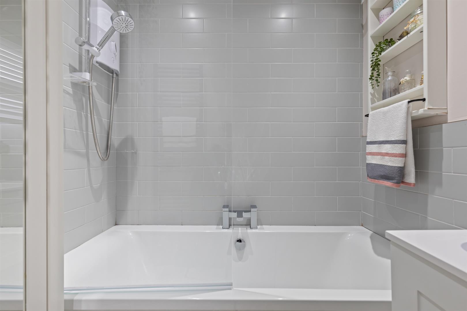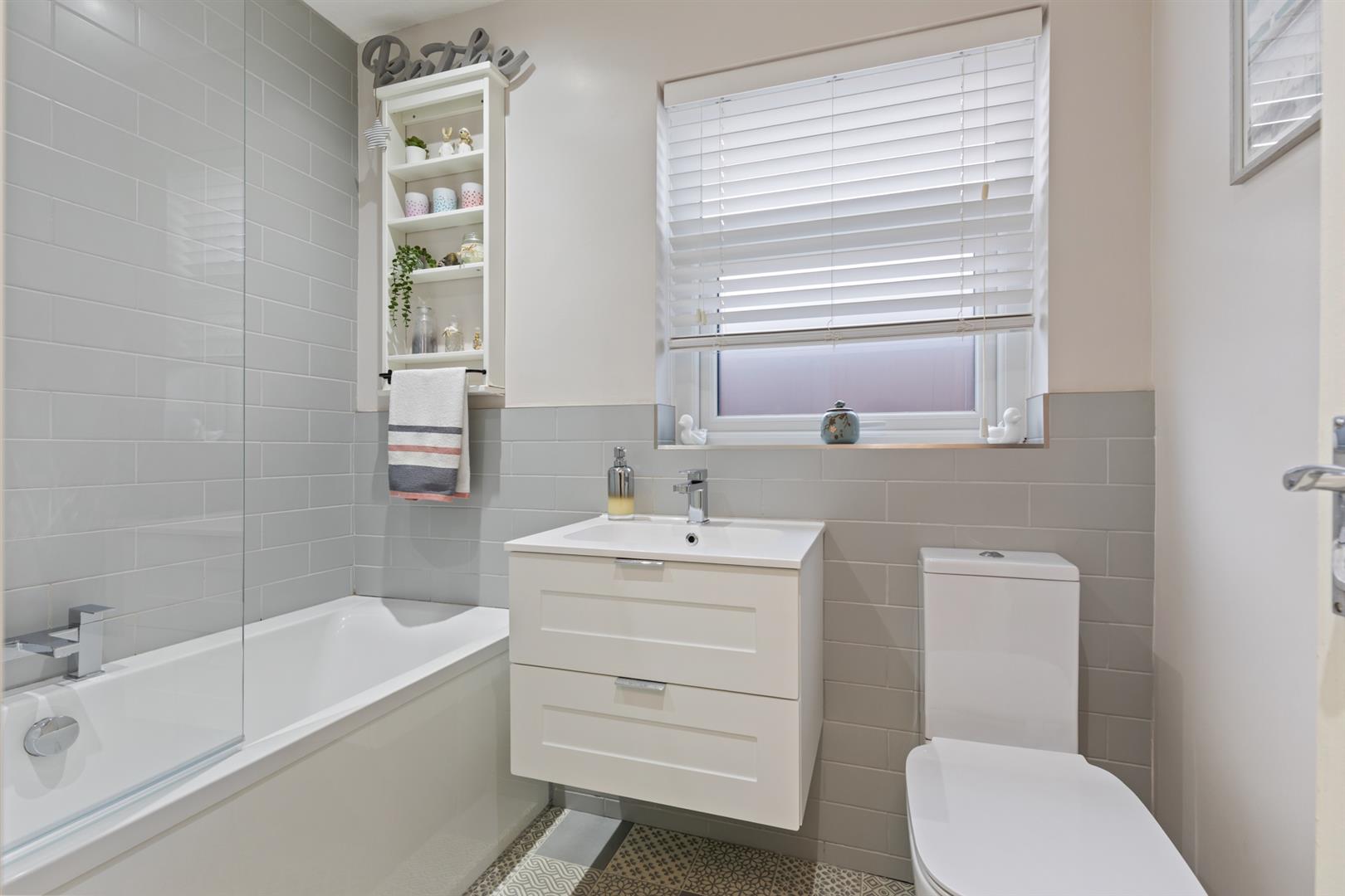Modern white suite comprising panelled bath with mixer tap, electric overhead shower, shower screen, part tiled walls, vanity unit with mixer tap and storage, low flush w.c., tile effect lmainate flooring.