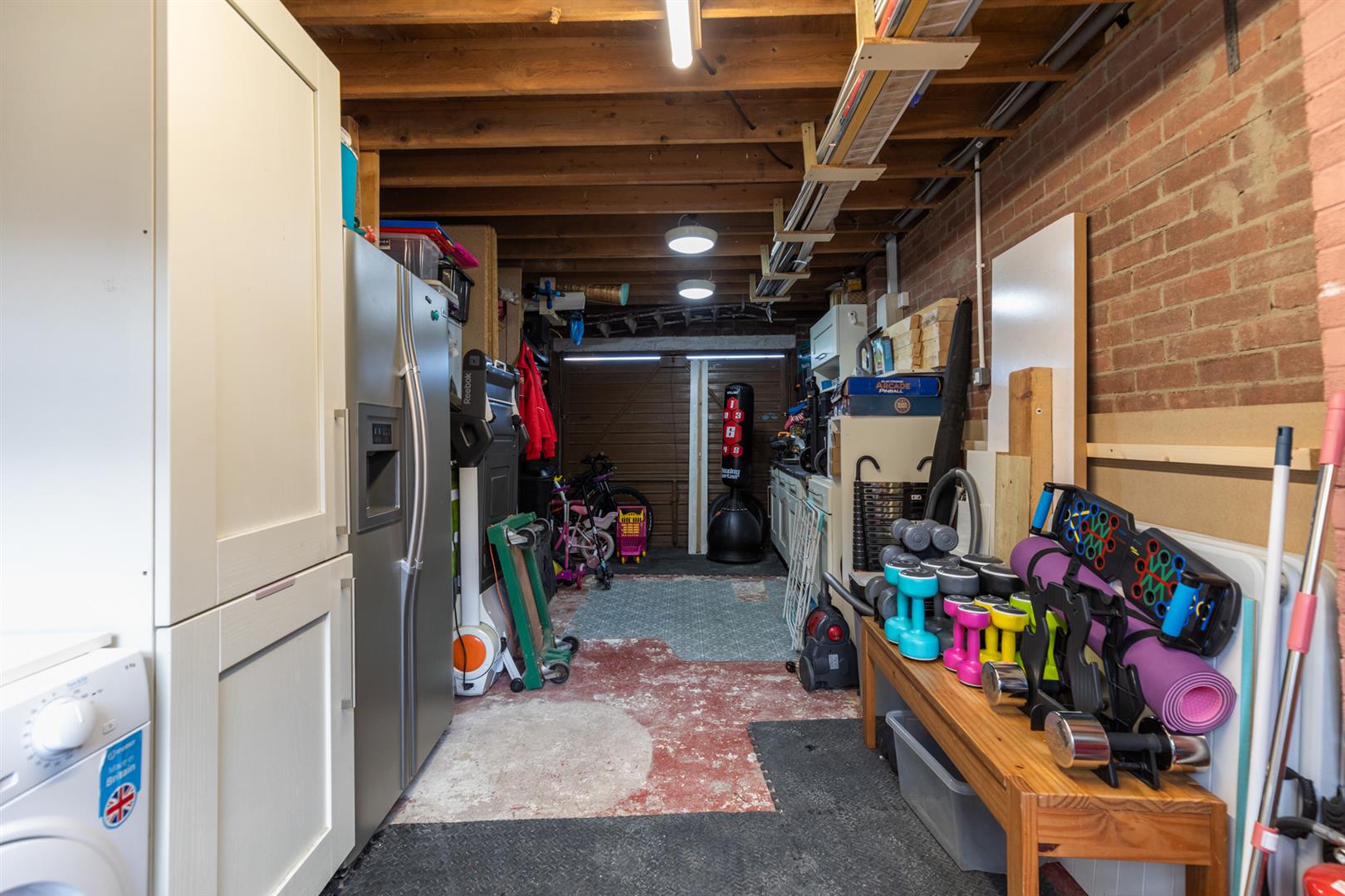 Up and over door, power and light, plumbed for washing machine and tumble dryer.