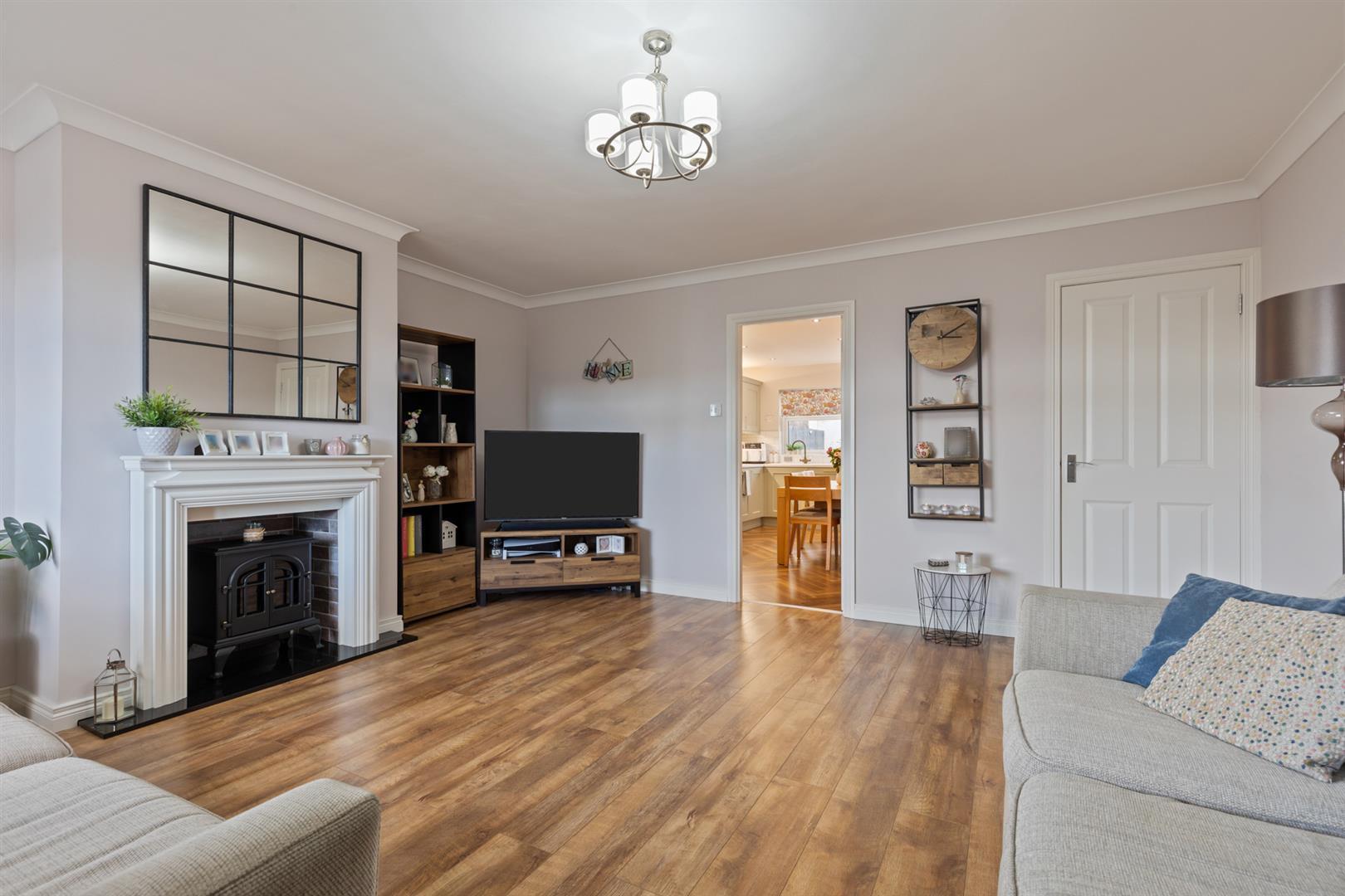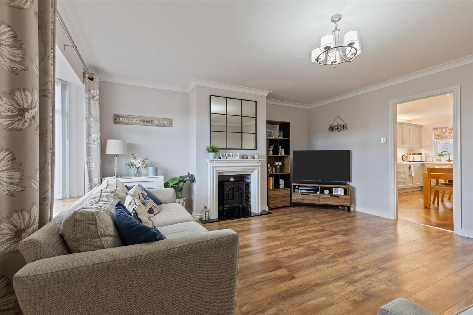 Bright living room with feature fireplace and wood effect laminate flooring