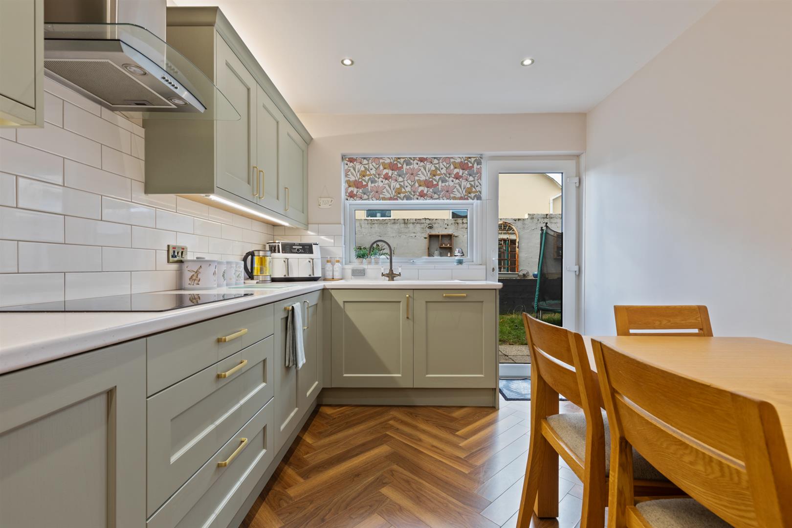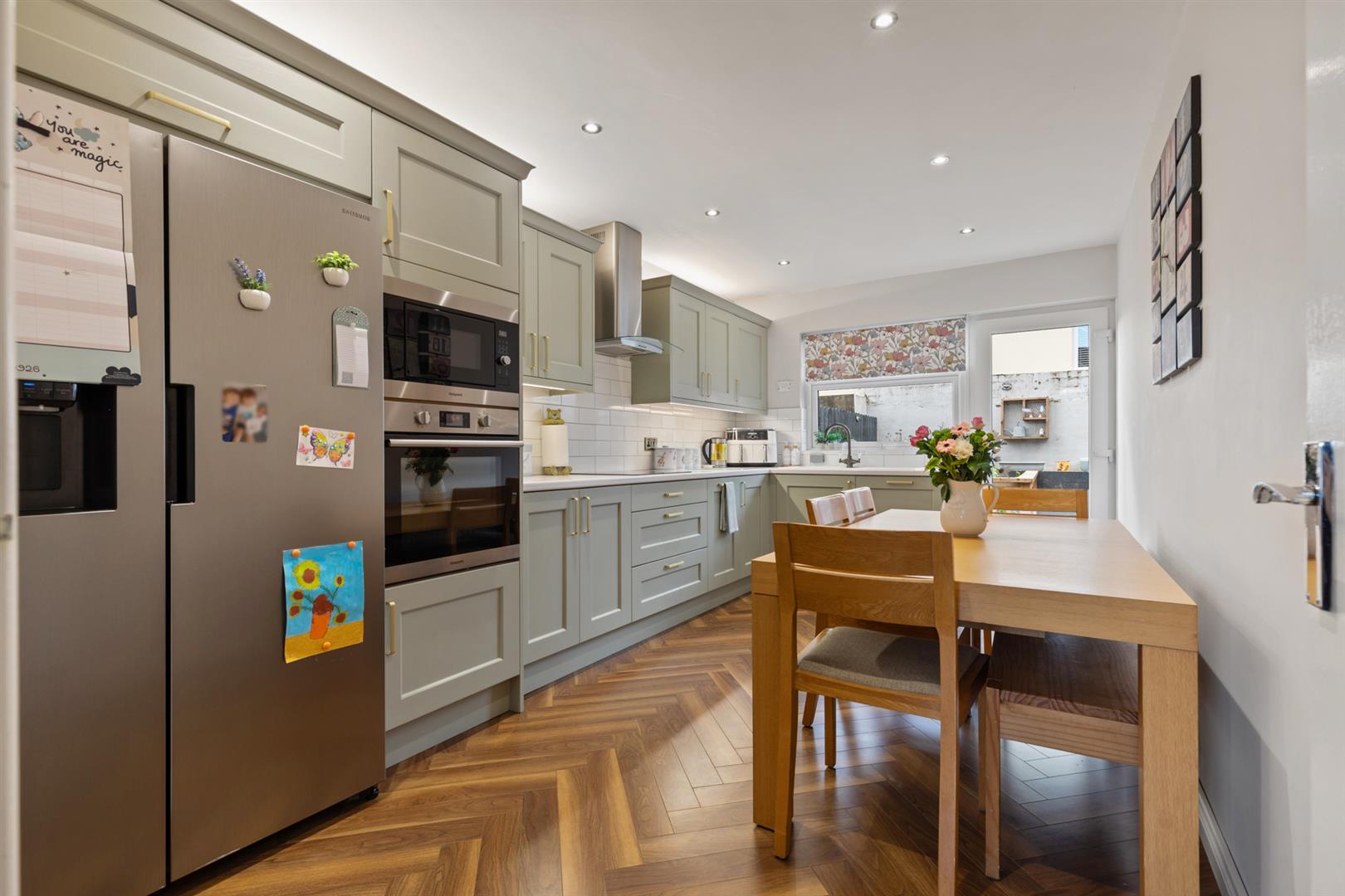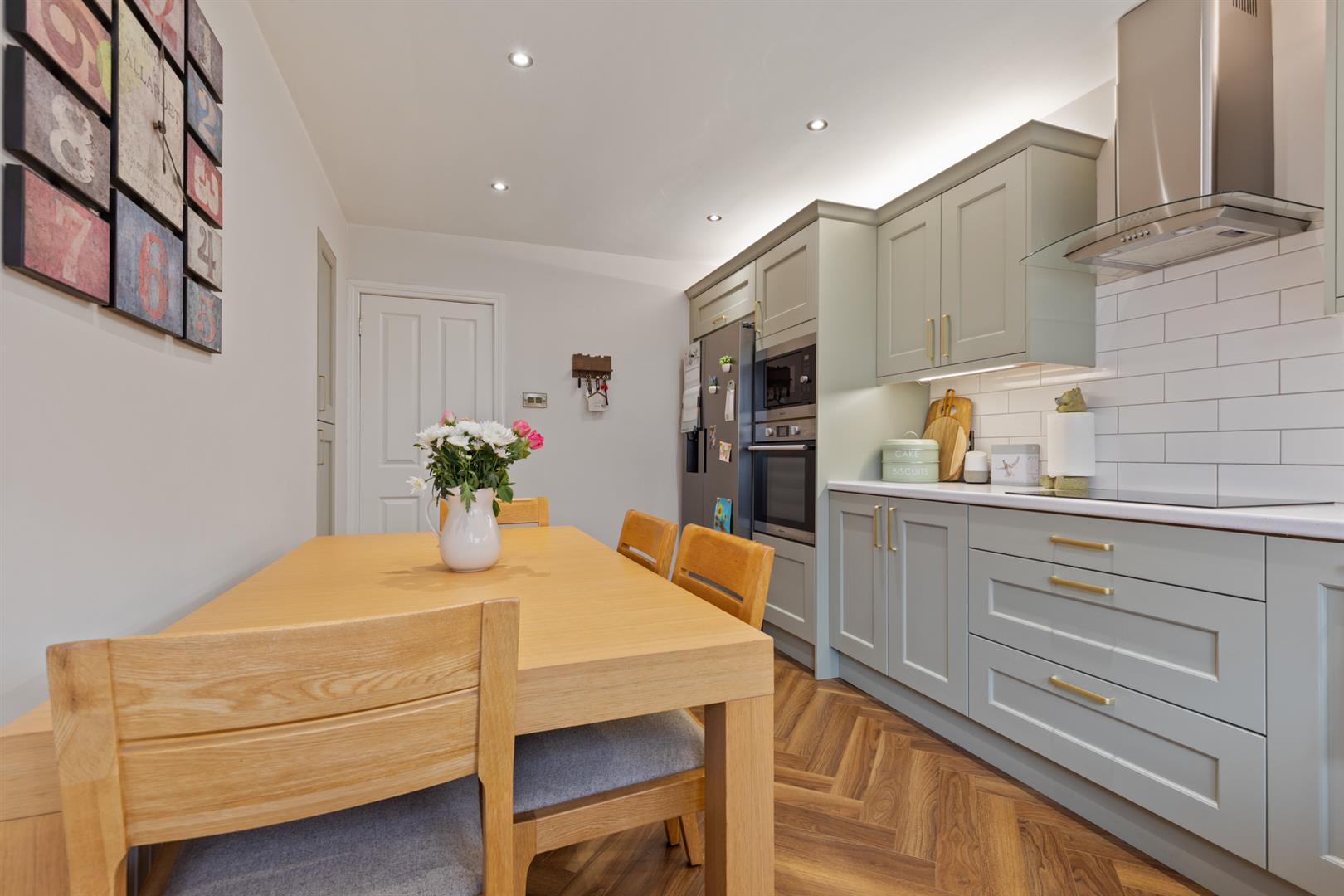 Modern range of high and low level units, laminate work surfaces, 1 1/4 bowl sink unit with mixer tap, built-in oven and microwave, ceramic hob, stainless steel extractor fan, housing and plumbed for American style fridge freezer, integrated dishwasher, tiled splashback, herringbone style flooring, recessed spotlighting, door to rear.