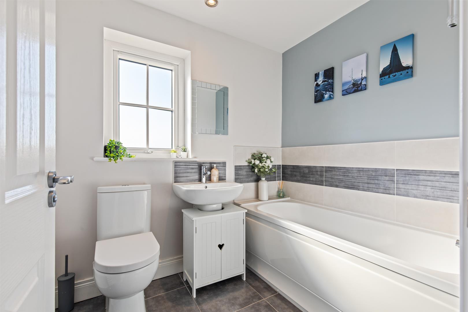 White suite comprising low flush wc, semi pedestal wash hand basin with tiled splashback, panelled bath with handheld shower, part tiled walls, tiled flooring, extractor fan and recessed spotlights.