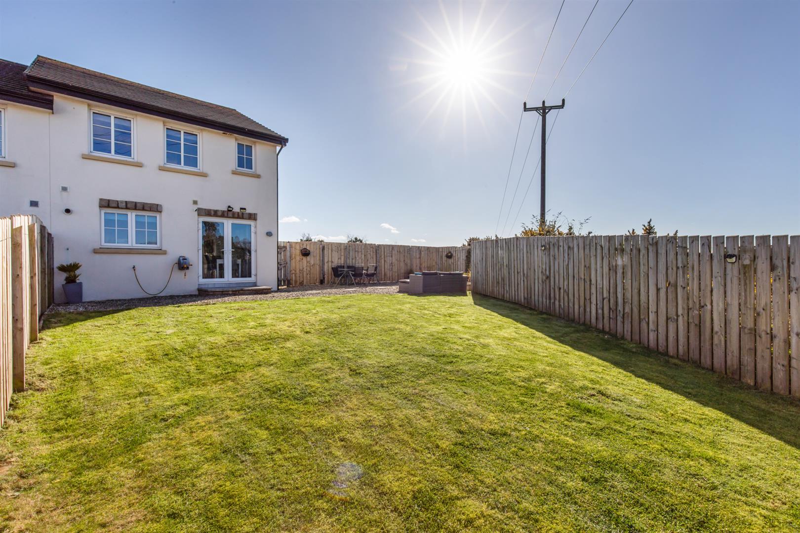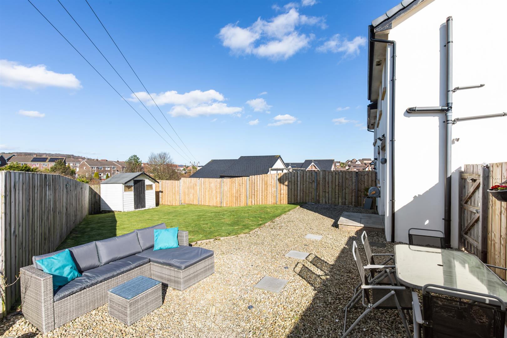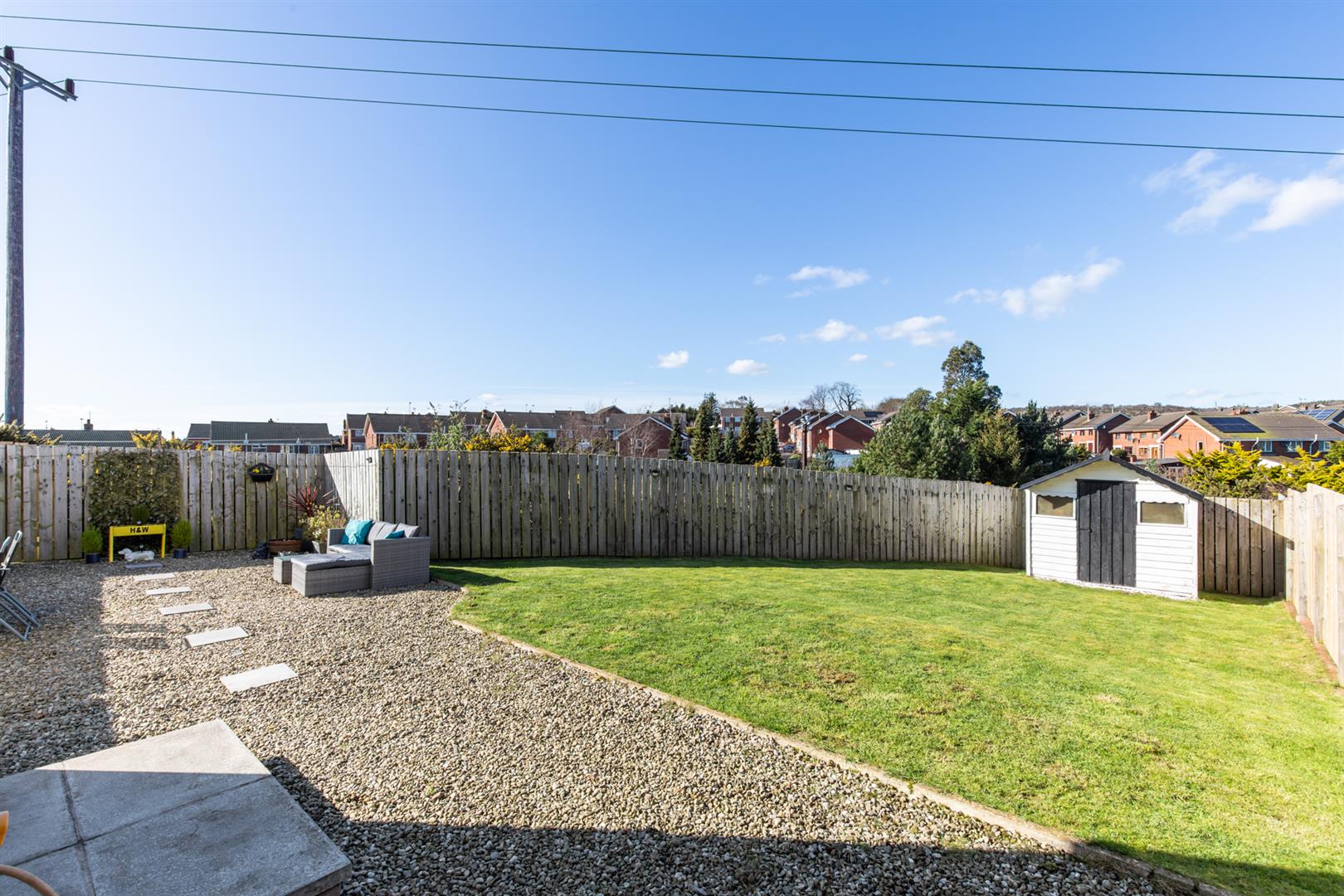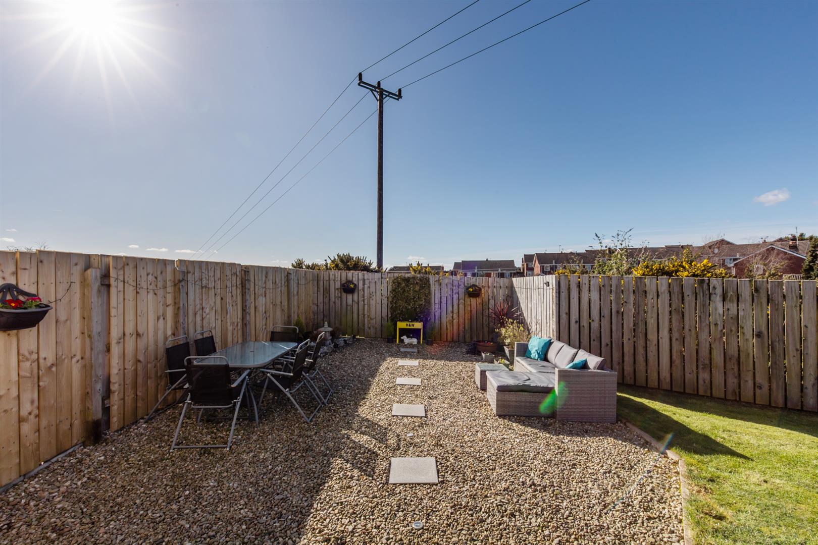 Rear: Enclosed rear garden, patio area, space for shed, areas in lawn and stone, outside tap and light.