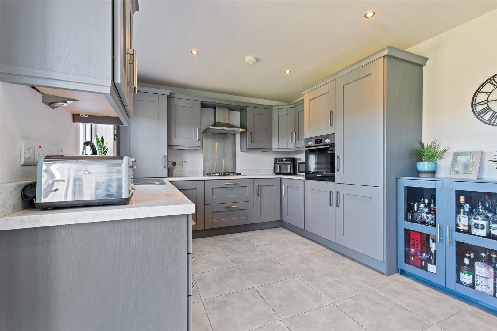 Modern range of high and low level units with laminate work surfaces, inset stainless steel sink unit with mixer tap, integrated appliances to include; fridge/freezer, washing machine, dishwasher, built in electric oven, four ring gas hob, stainless steel extractor fan, space for dining, tiled floor, recessed spotlights and patio door access to enclosed rear garden.