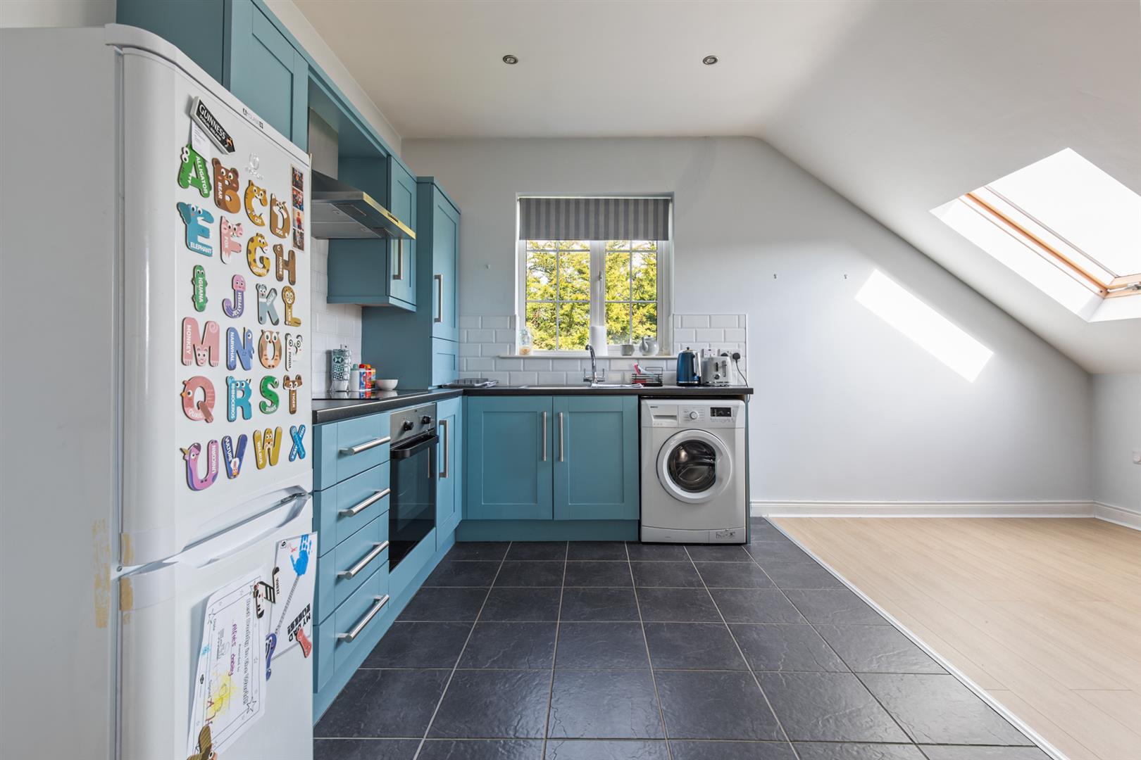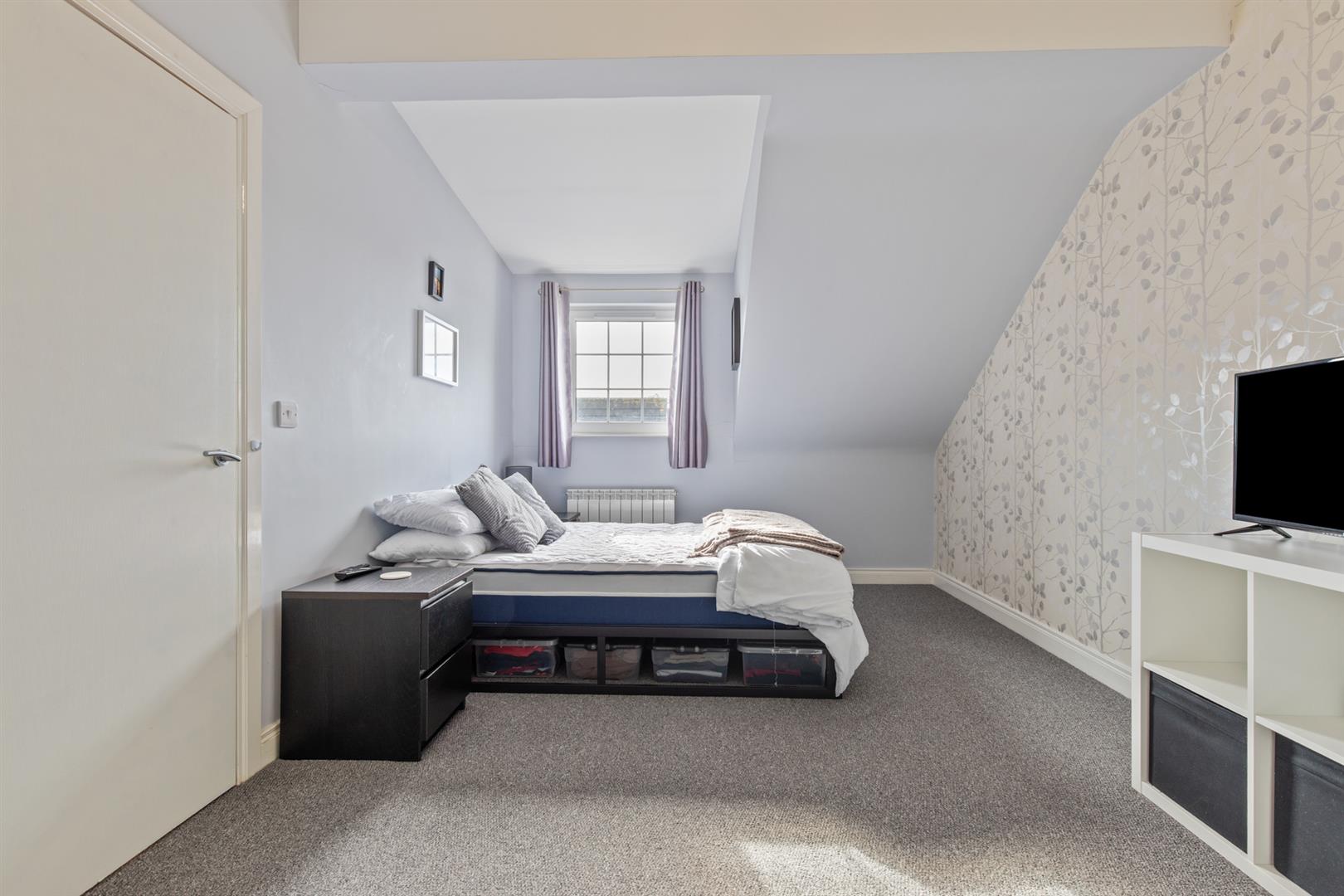 There are two bedrooms, including a well-proportioned principal bedroom, while the second bedroom benefits from a Velux window, making it ideal as a guest room, home office or study. The bathroom is finished with a white suite, including a panelled bath with overhead shower, complemented by tiled flooring and partially tiled walls.
