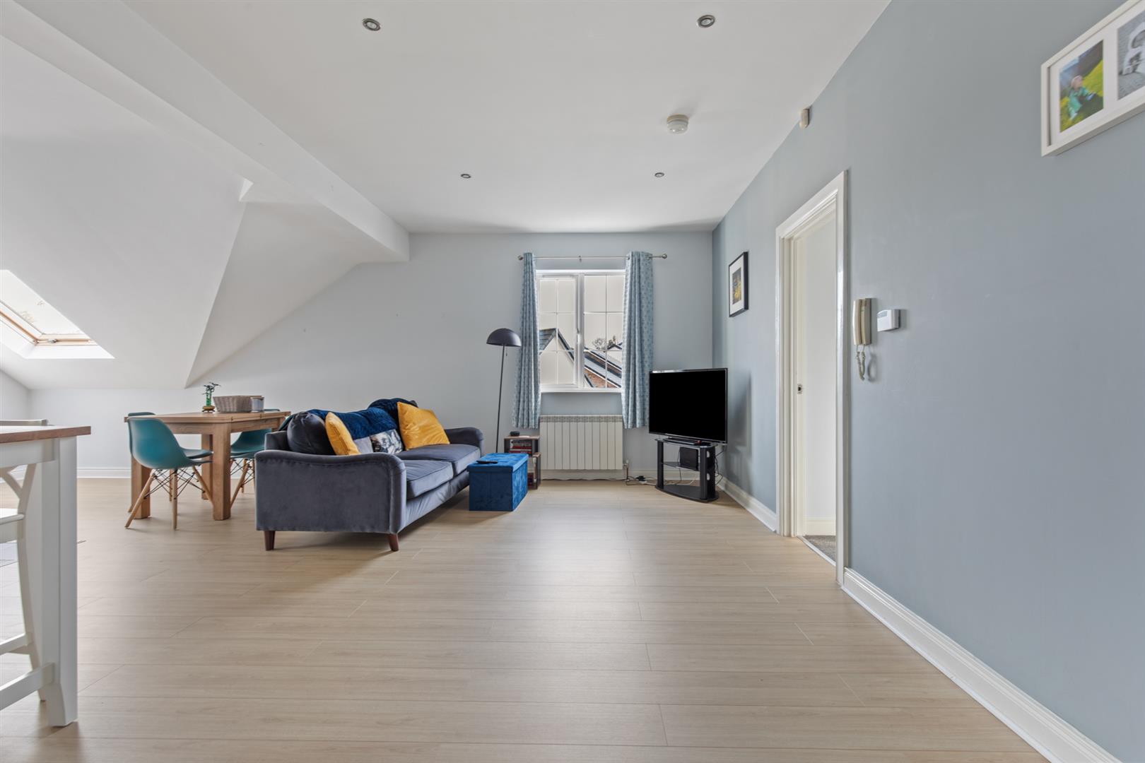 Dual aspect windows, recessed spotlights and wood laminate floor.