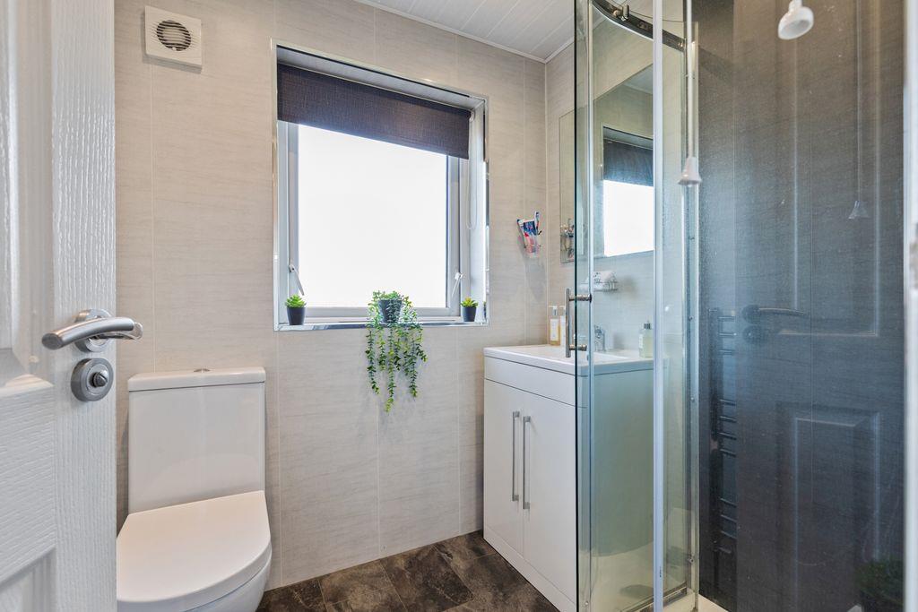 White suite comprising: Low flush W.C. Panelled shower cubicle with Mira Electric shower. Sliding shower door. Vanity unit with inset basin and mixer tap. Tile effect laminate flooring. Panelled walls. White uPVC double glazed window. Panelled ceiling. Downlights. Extractor fan. Wall mounted heated towel rail.
