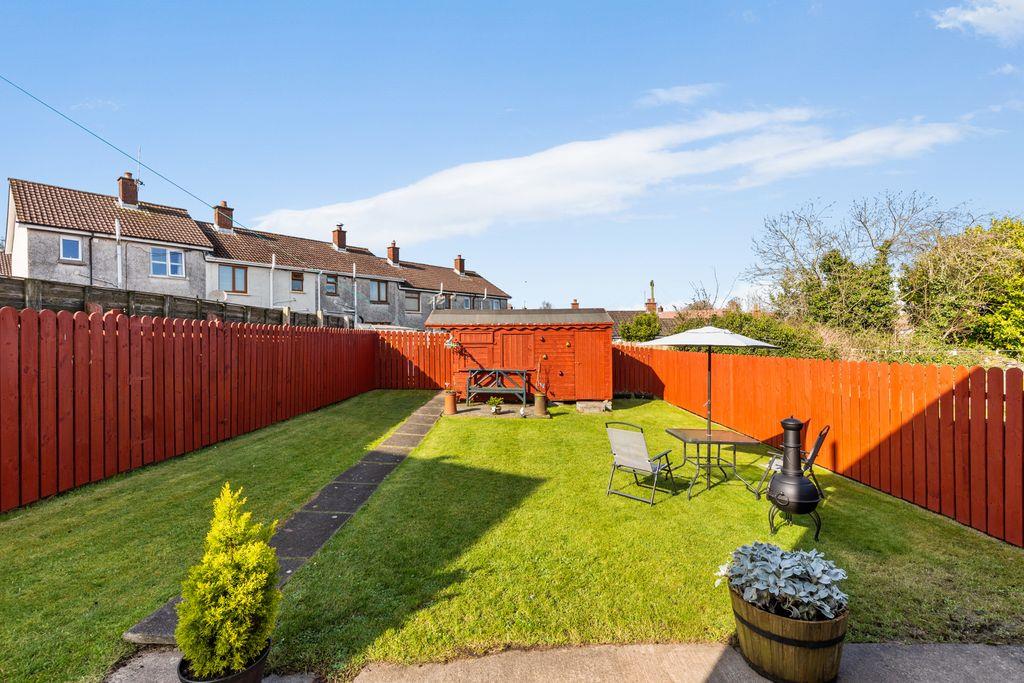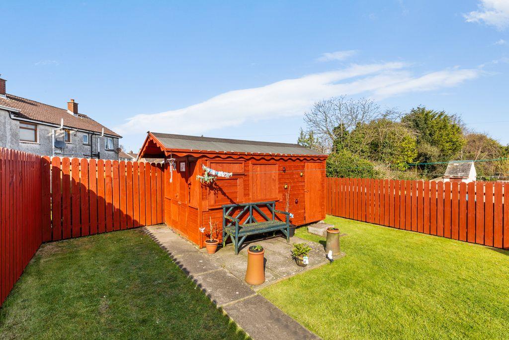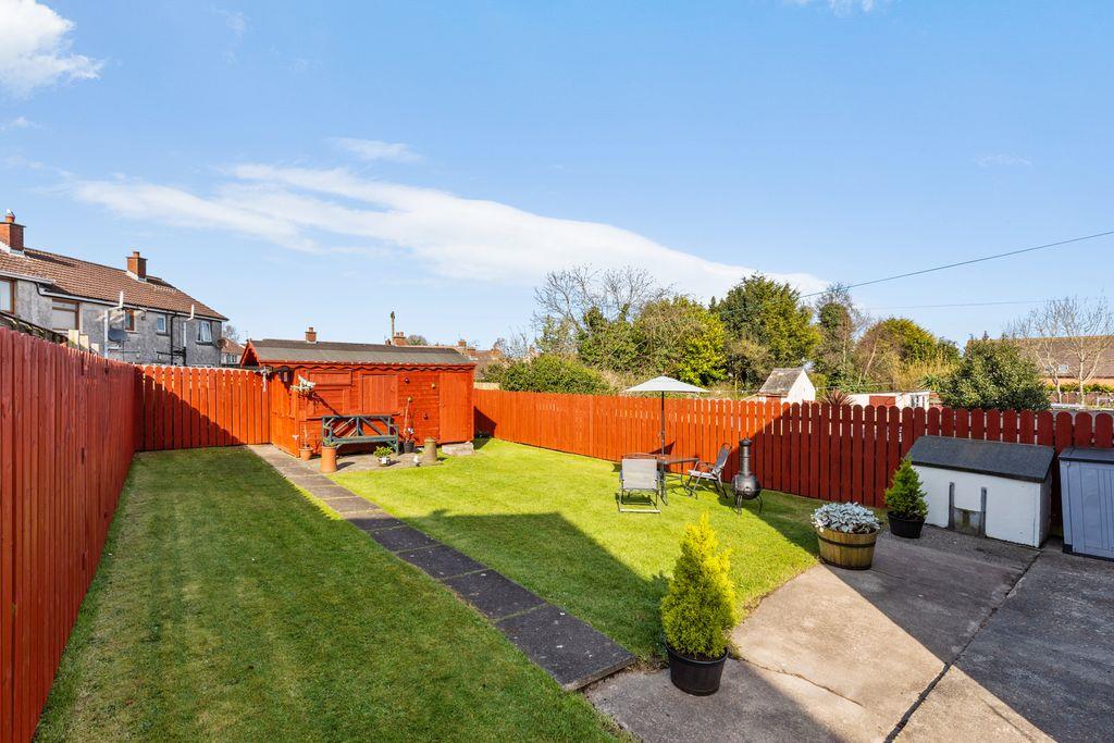 Garden laid in lawn. Part recessed PVC oil tank. Boiler house. Outside tap. Security light point. Paved path. Paved patio area. 2 part wooden garden shed.