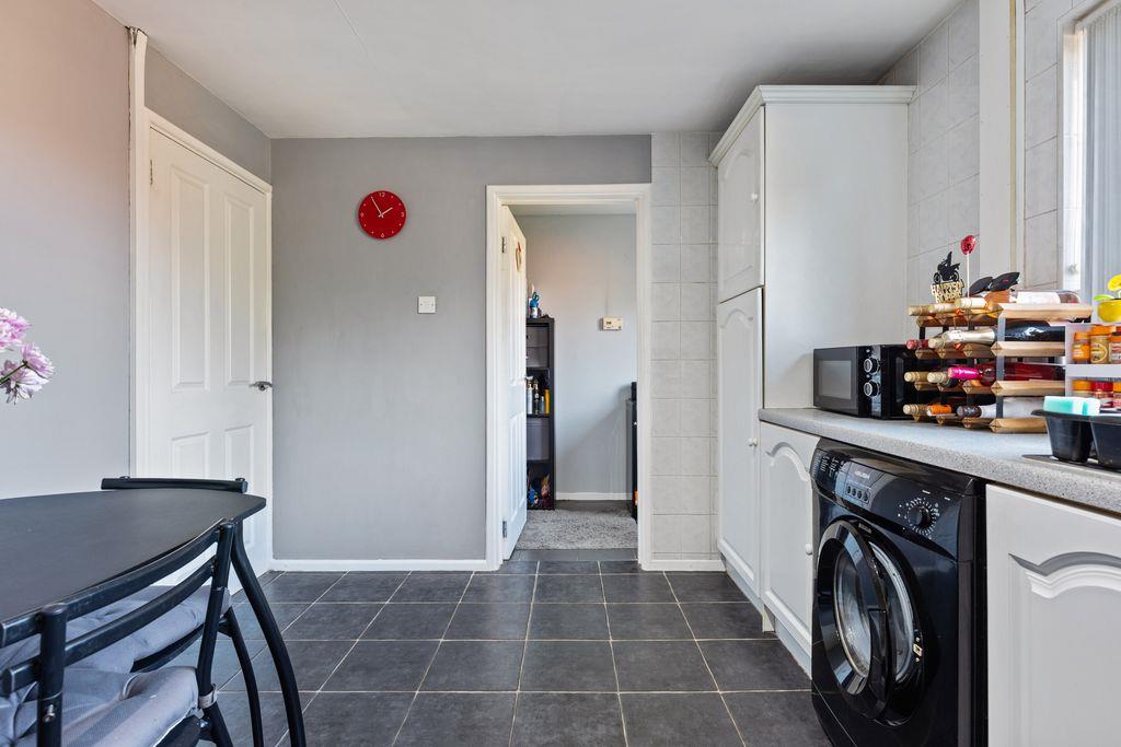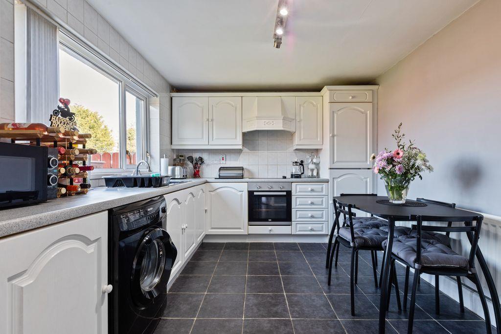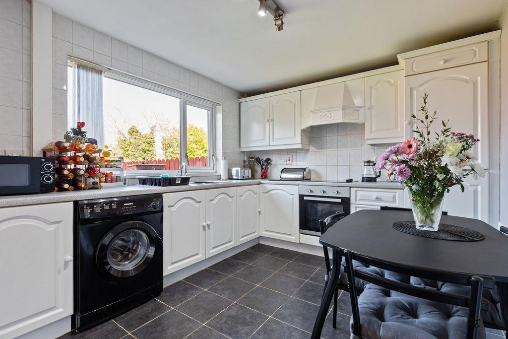 Attractive range of high and low level units with roll edge work surfaces. 11/4 bowl stainless steel sink unit with mixer taps. Extractor fan. Integrated 4 ring hob and oven. Integrated fridge/freezer. Plumbed for washing machine. Double panel radiator. Part tiled walls. Tiled floor. White uPVC double glazed windows.