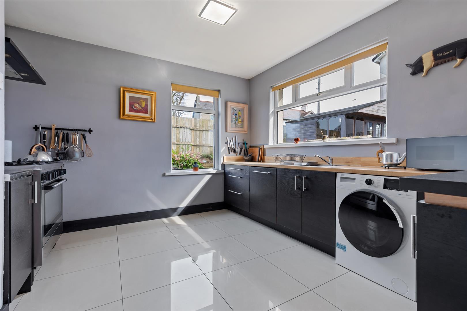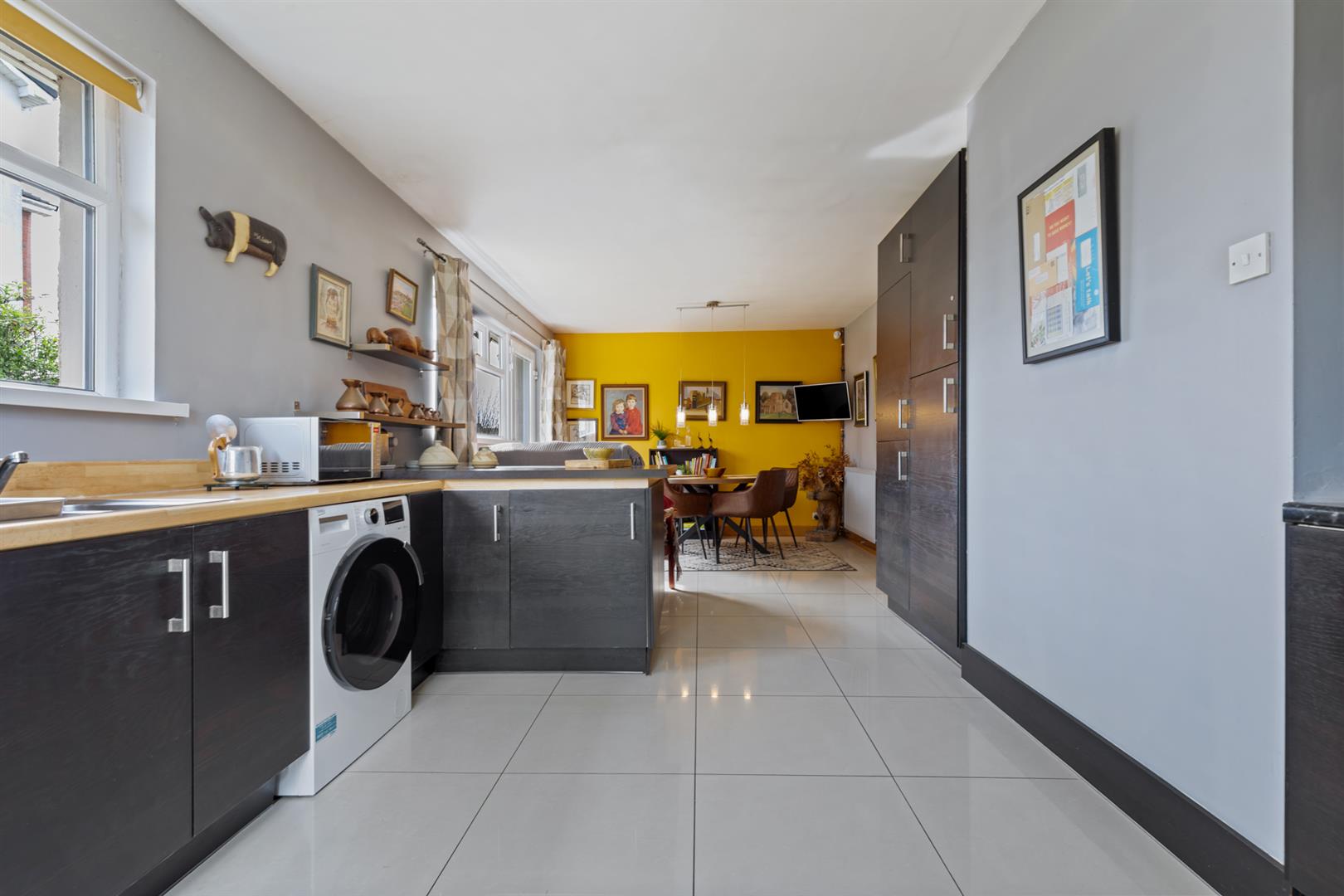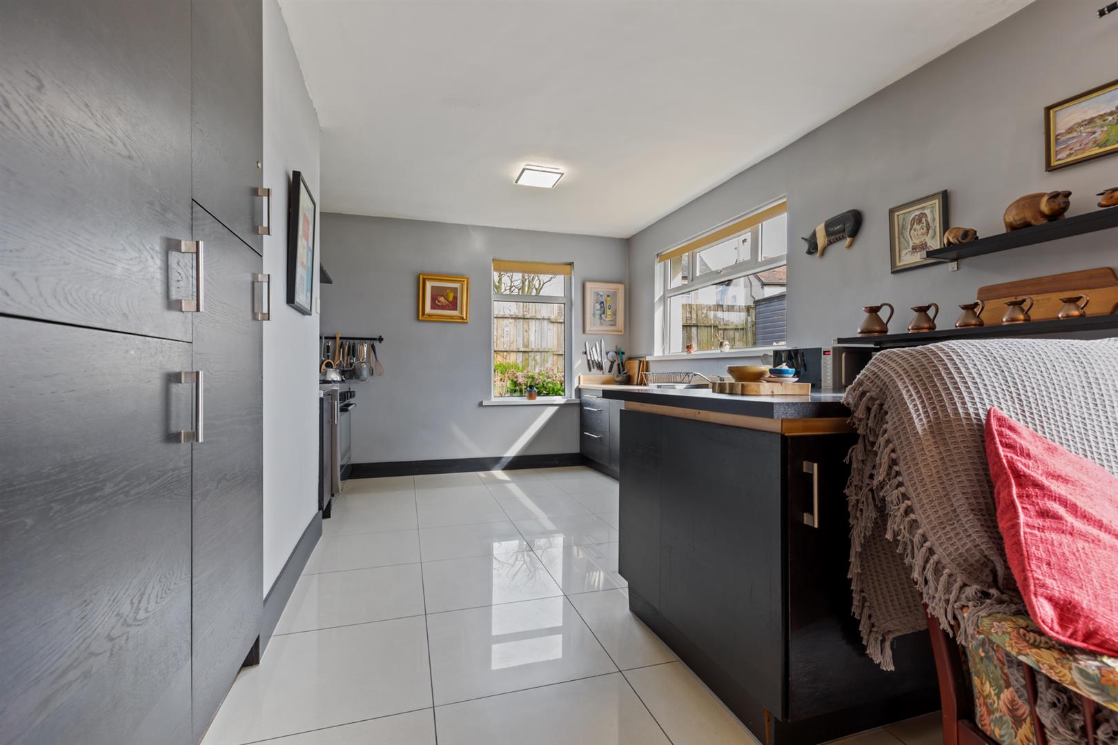 Modern range of high and low level units, wood effect work surfaces with matching upstands, integrated fridge and freezer, space for range cooker, integrated extractor hood, 1¼ bowl stainless steel sink unit with mixer tap and drainer, integrated dishwasher, plumbed for washing machine, tiled floor, open to dining area, door to rear garden.