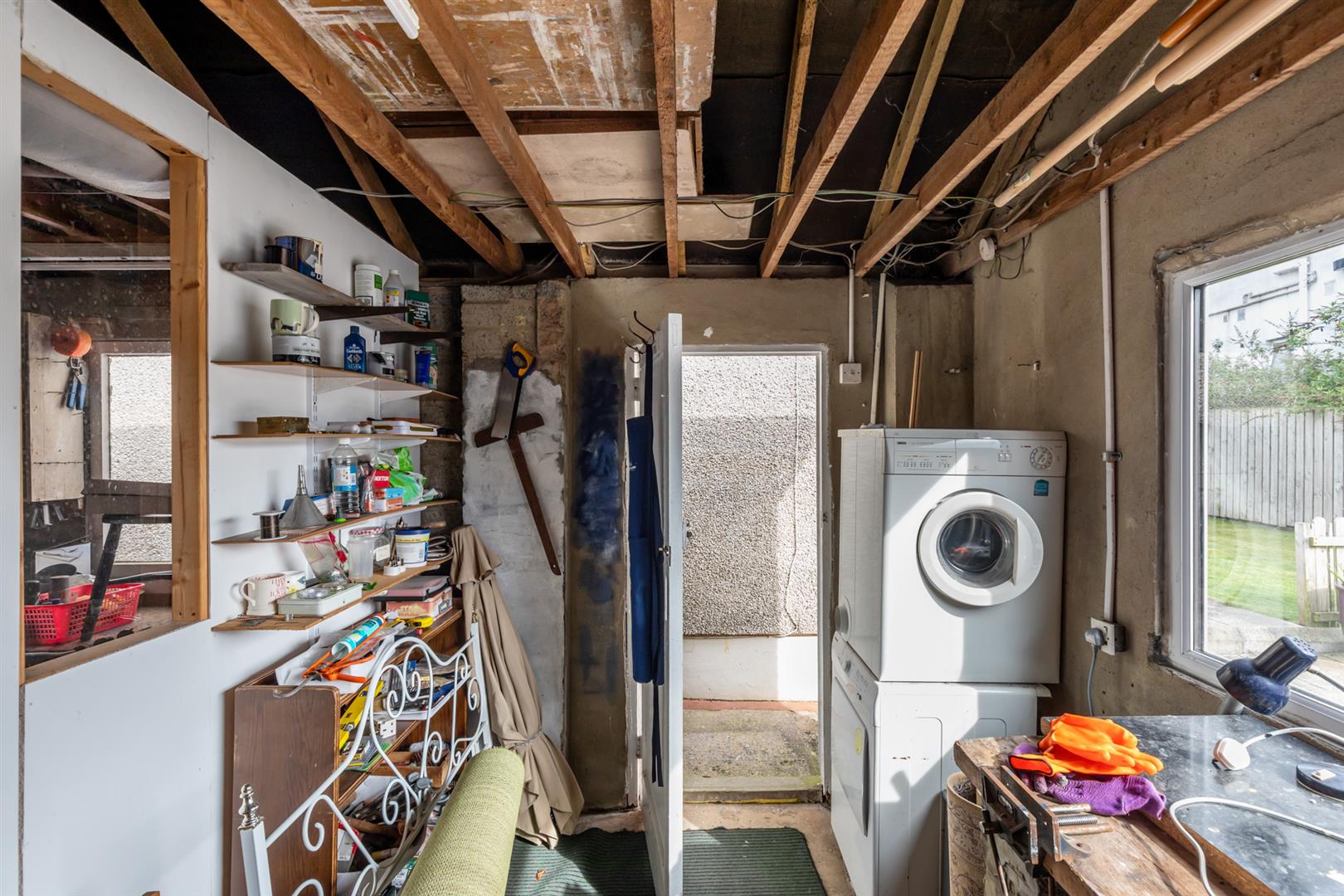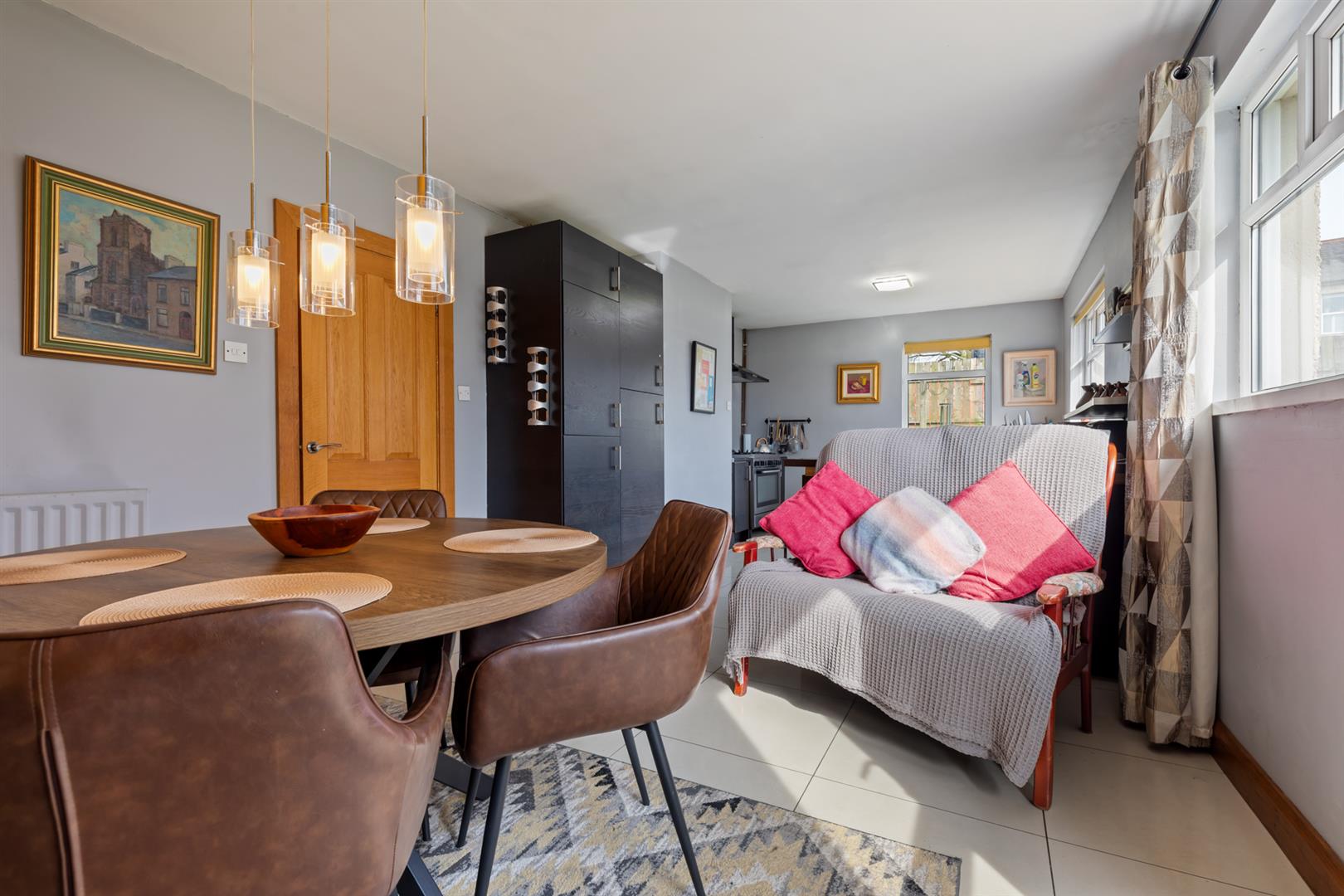 Internally, the property comprises a welcoming entrance hall with tiled flooring, double cloakroom and linen storage, along with access to the roofspace. The bright living room provides a comfortable reception space, while the generous kitchen is fitted with a modern range of high and low level units, wood effect work surfaces and a range of integrated appliances, with ample space for dining and direct access to the rear garden.