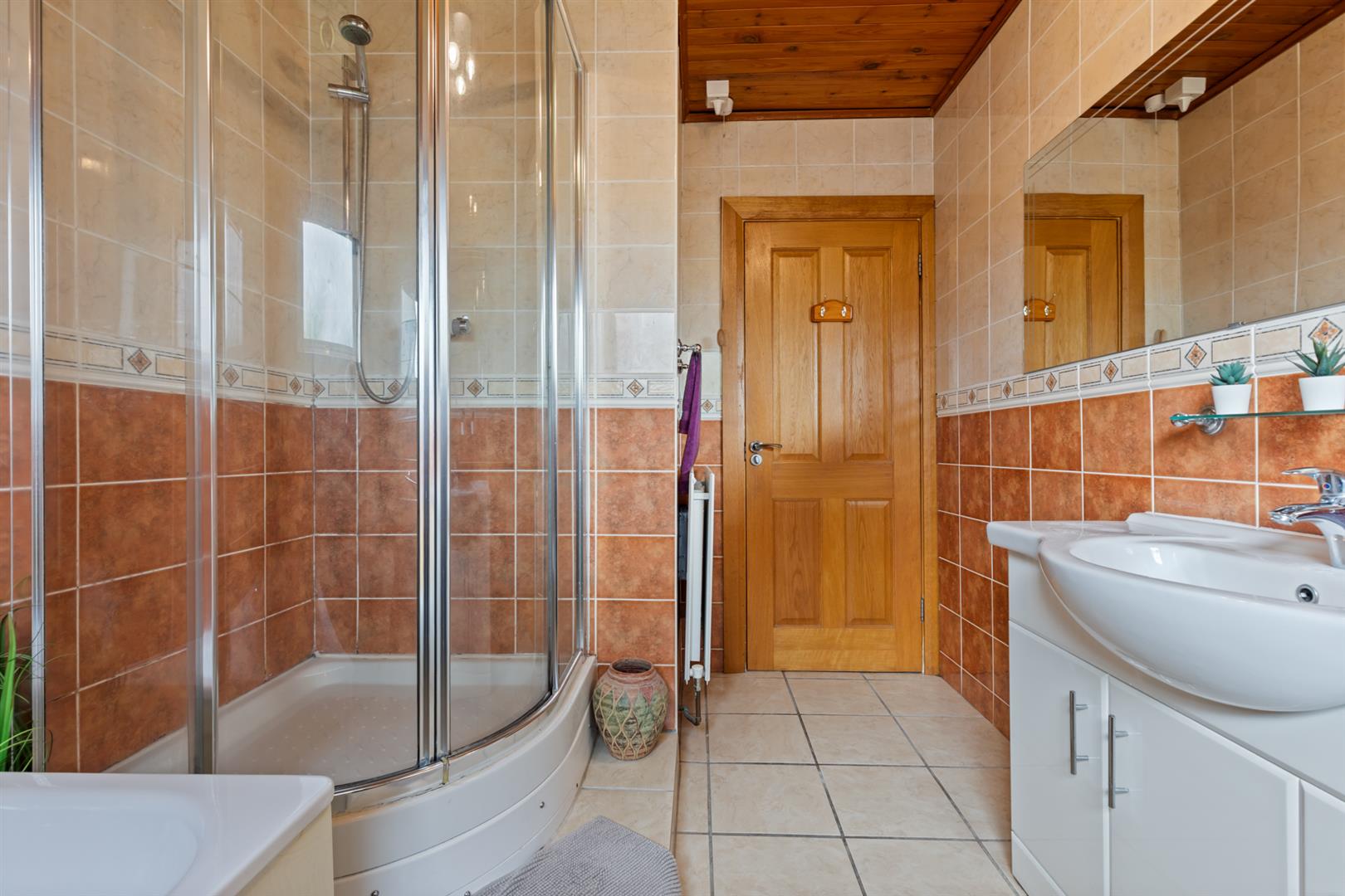 Family bathroom with white suite, panelled bath and separate corner shower cubicle