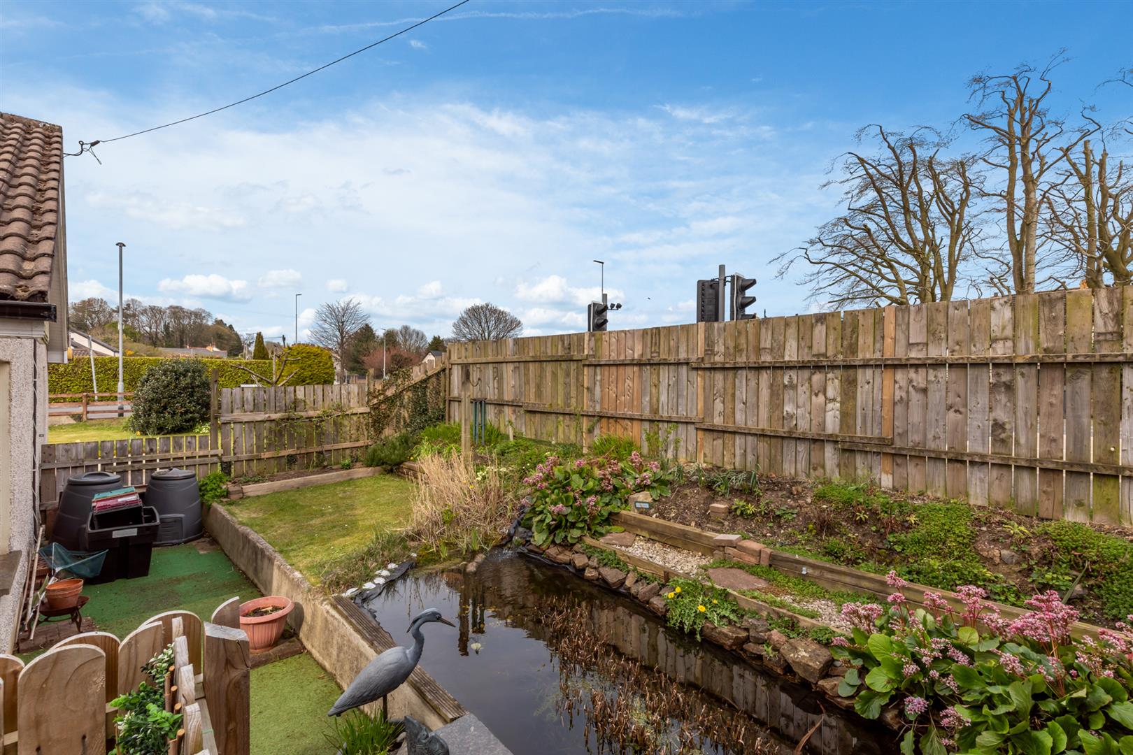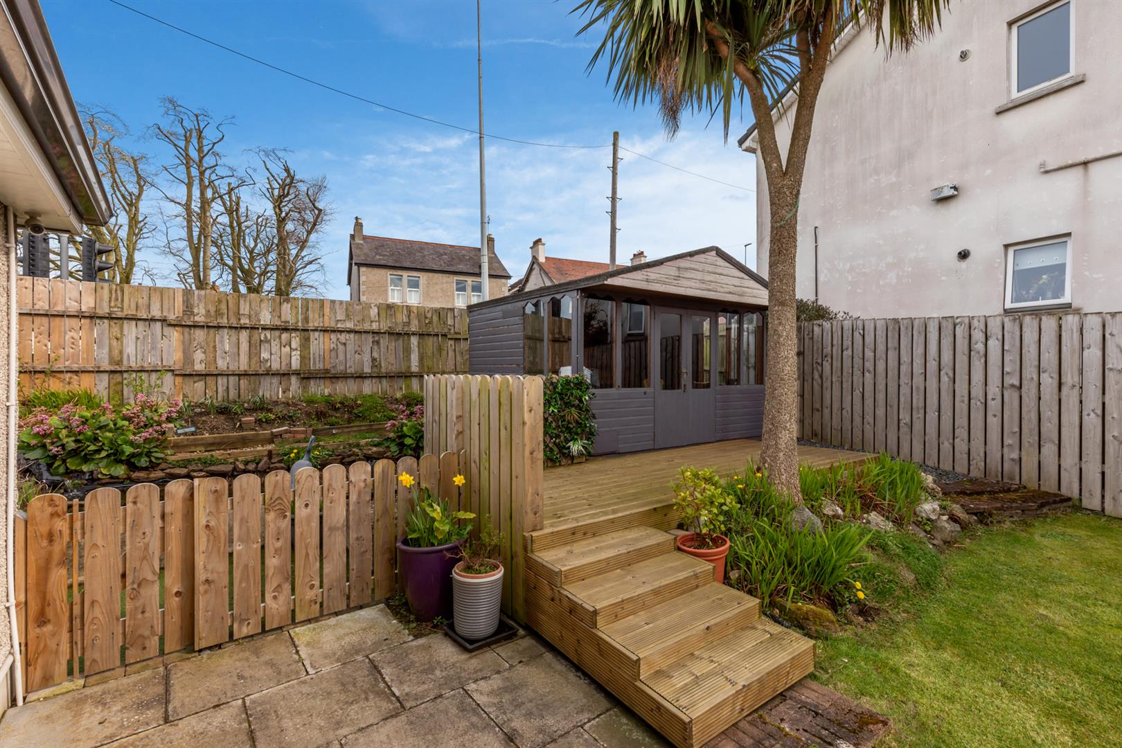 Rear garden in lawn paved entertaining area, raised decked area to summerhouse, raised flowerbeds and pond.