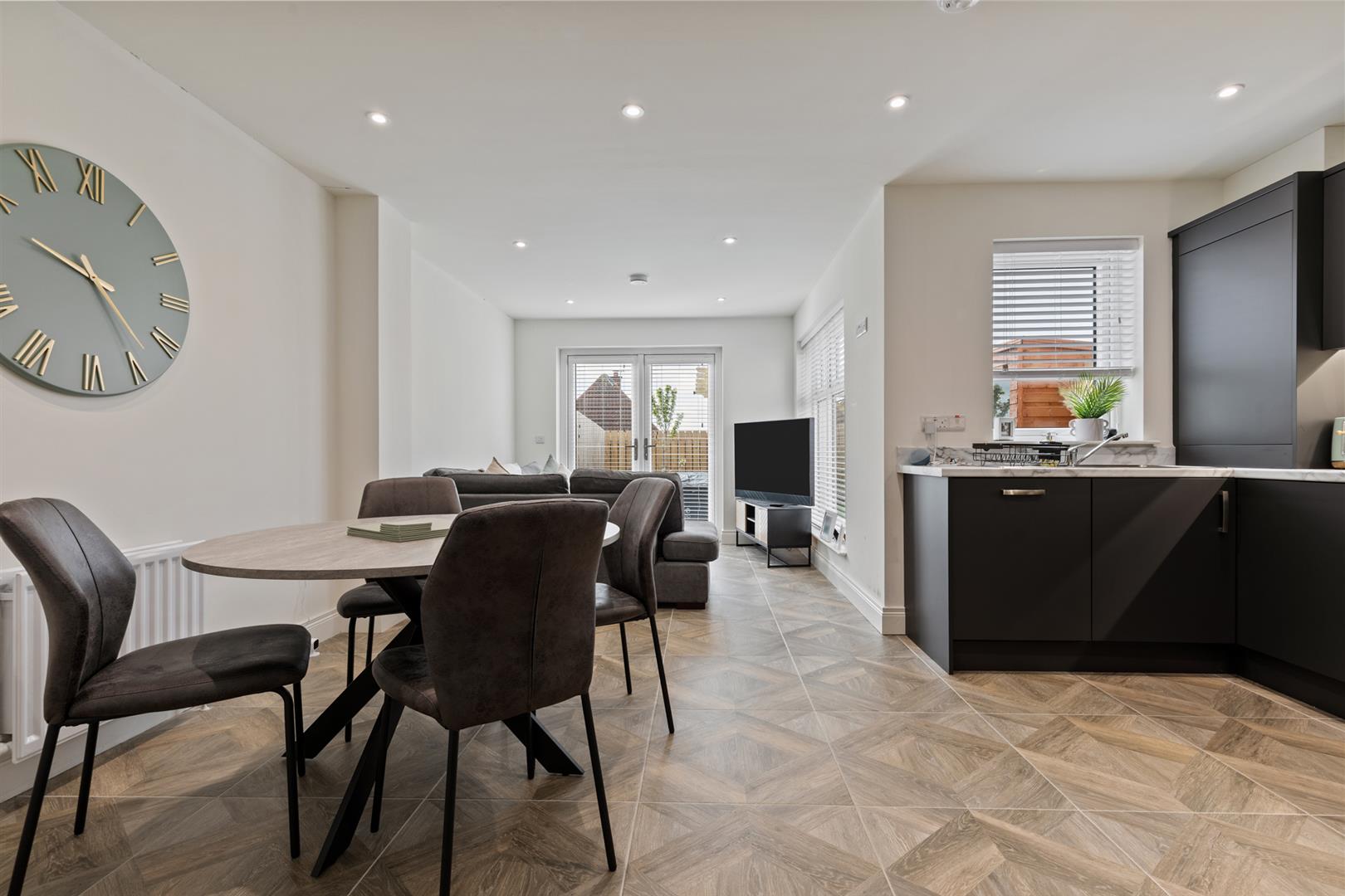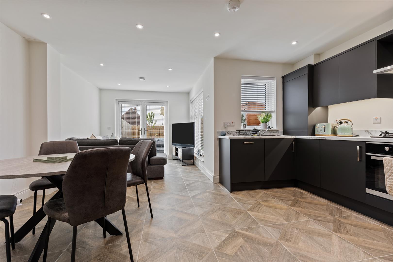 Wood effect tiled floor, recessed spotlights and patio doors to rear garden.