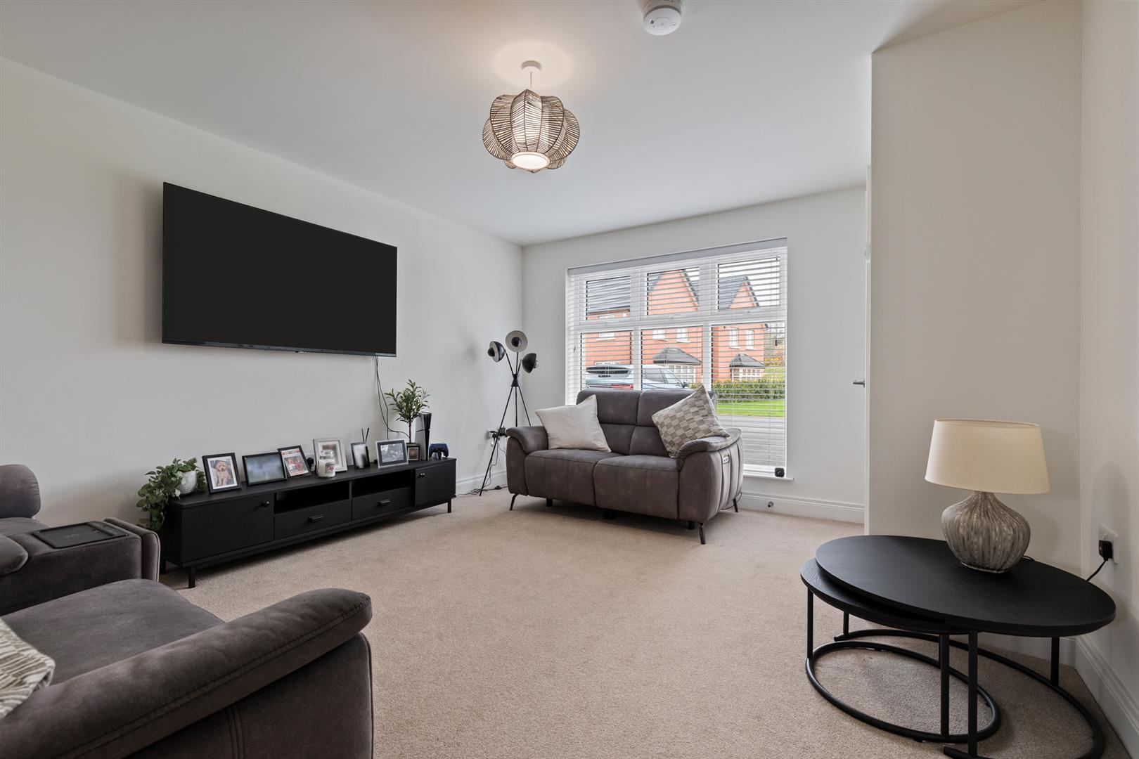 Spacious living room with dual aspect windows and under-stair storage