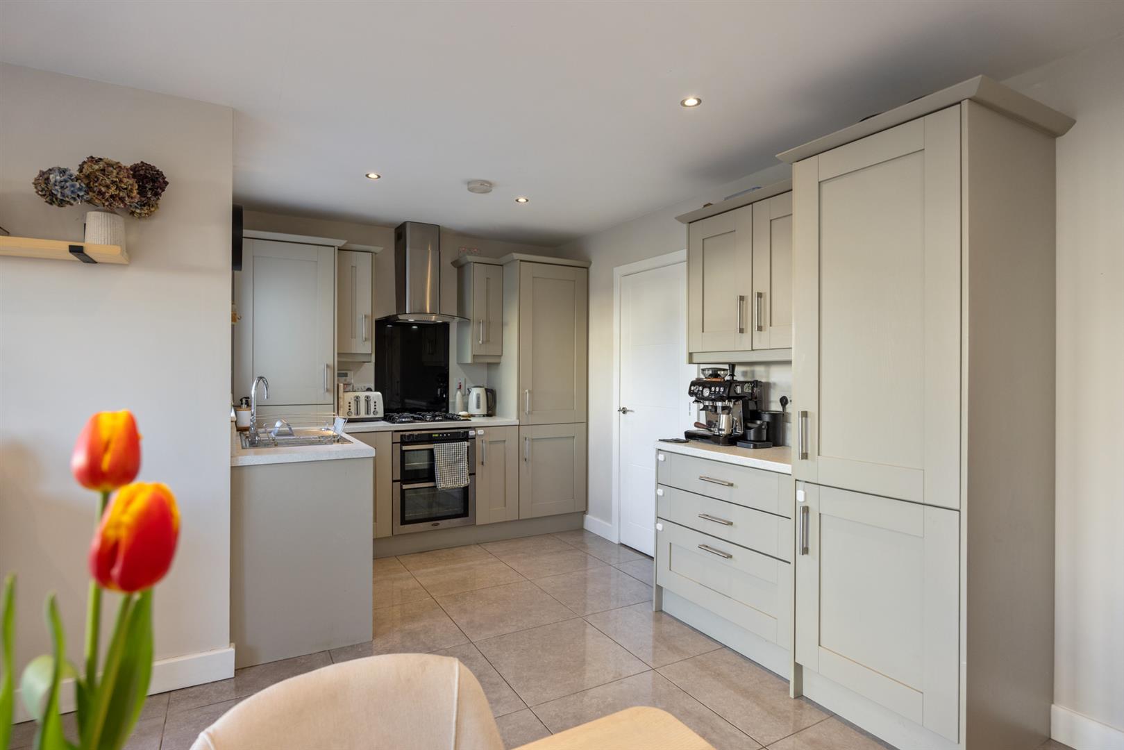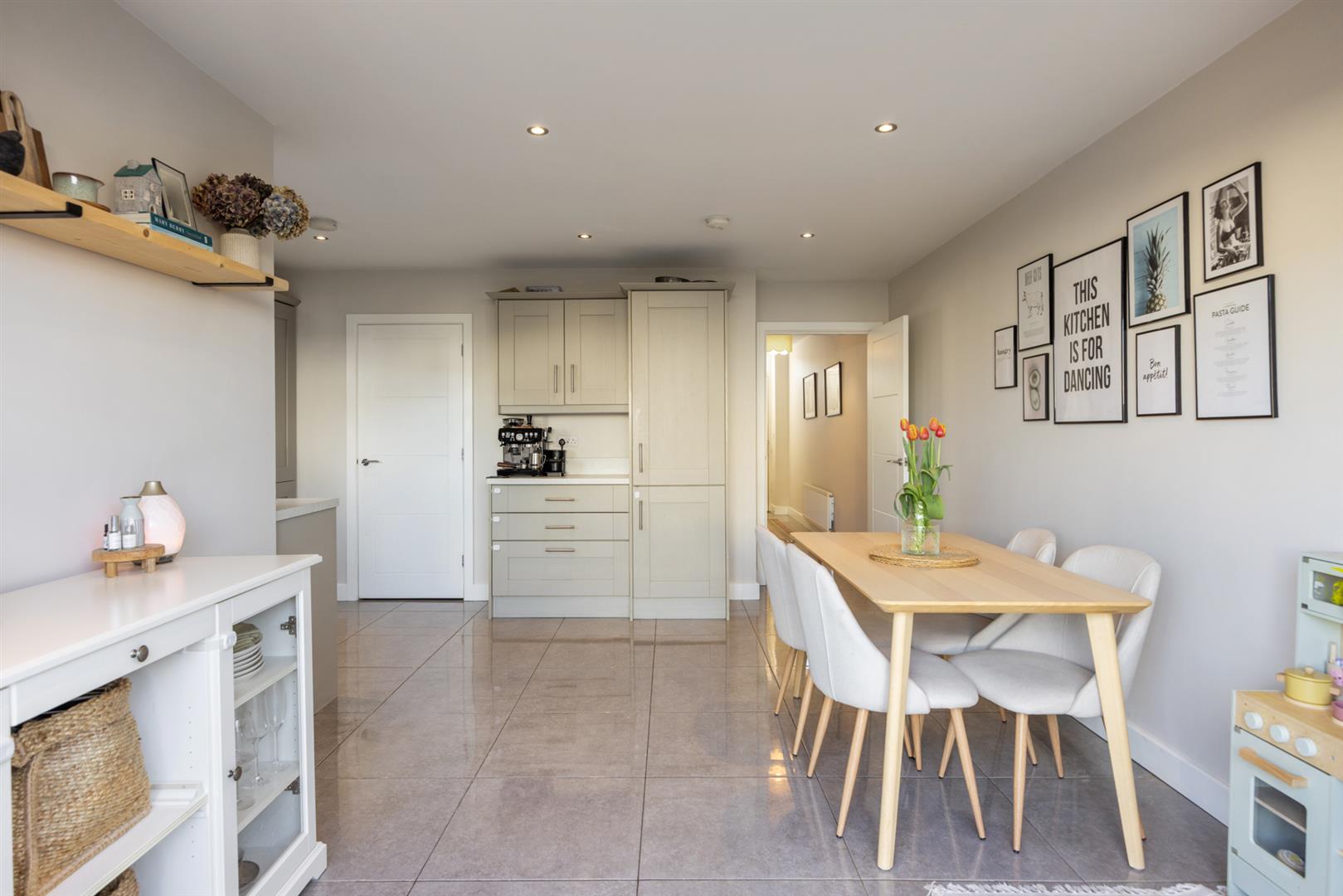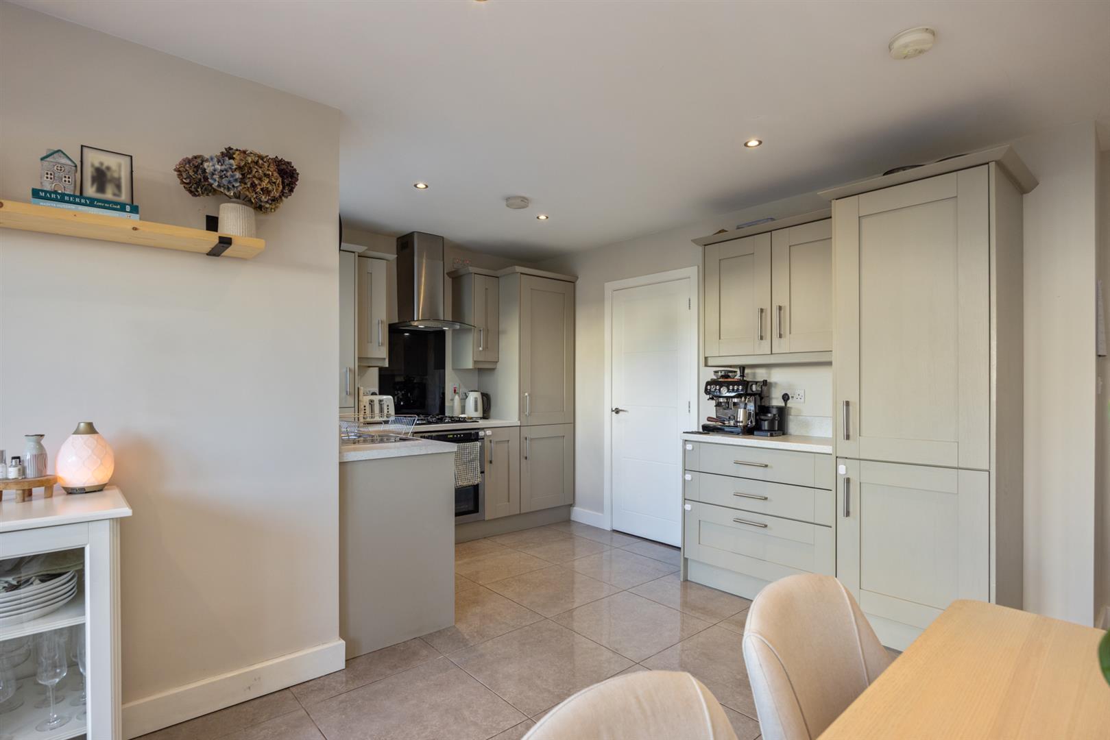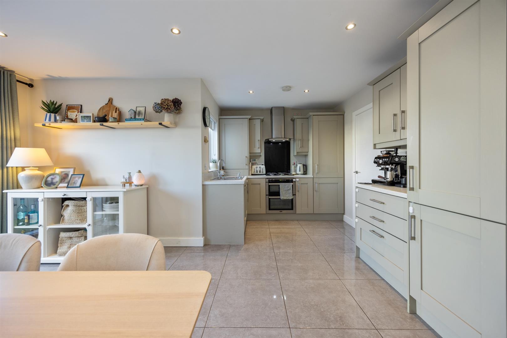 Modern fitted kitchen with range of high and low rise units with integrated stainless steel sink and drainer. Integrated dish washer and fridge/freezer. Electric oven and hob with overhead stainless steel extractor fan. Tiled floor. Space for dining/living. Double patio doors to rear garden. Door to utility room.