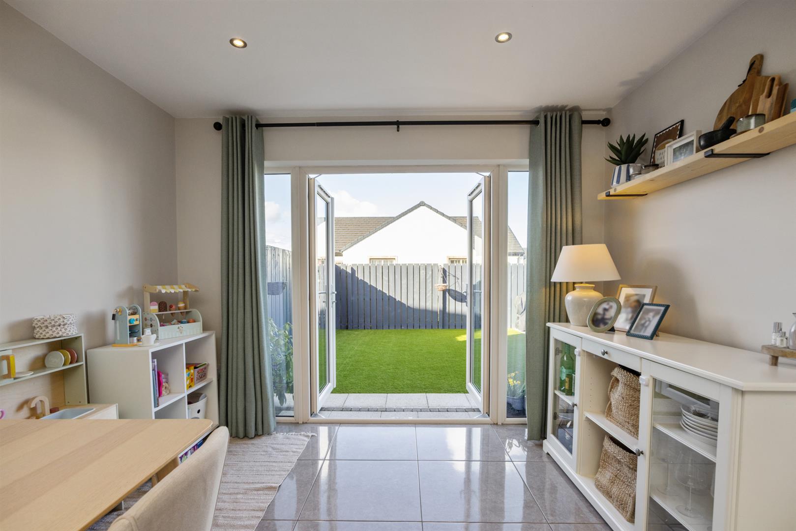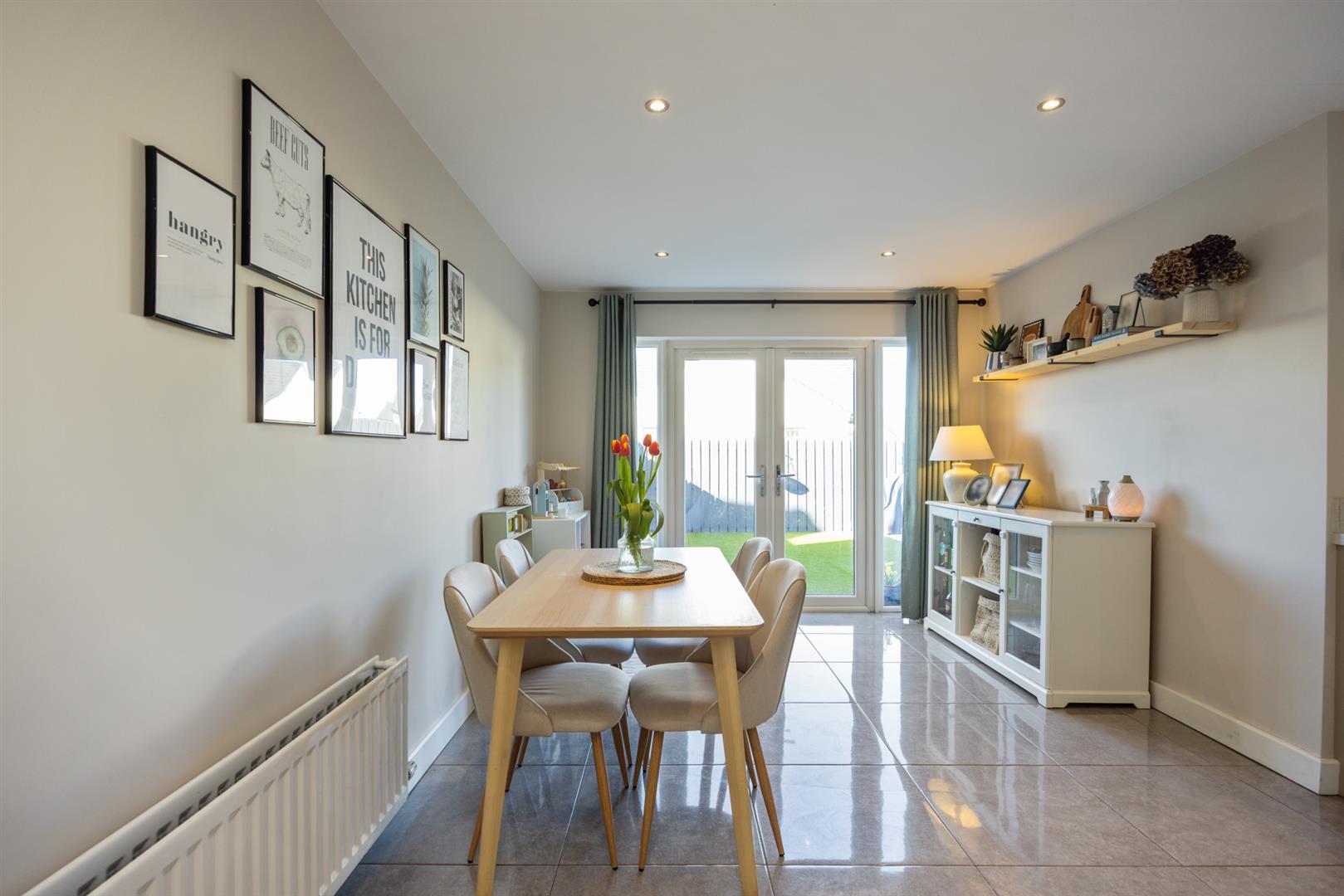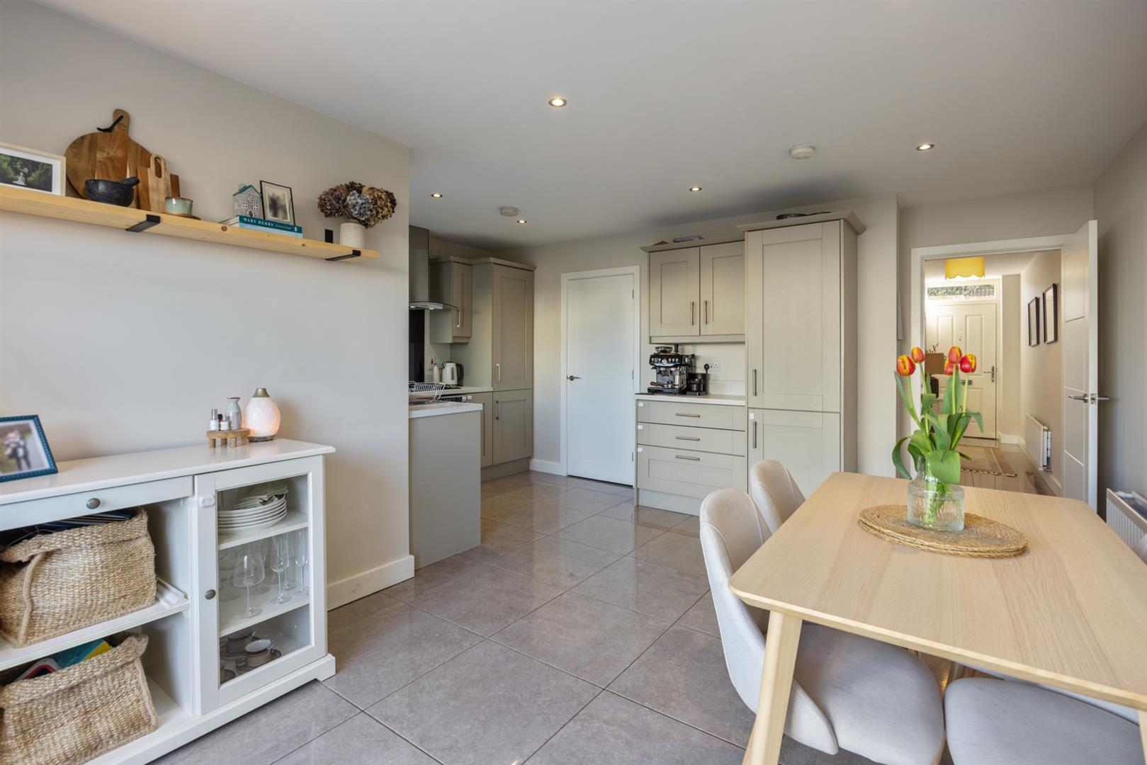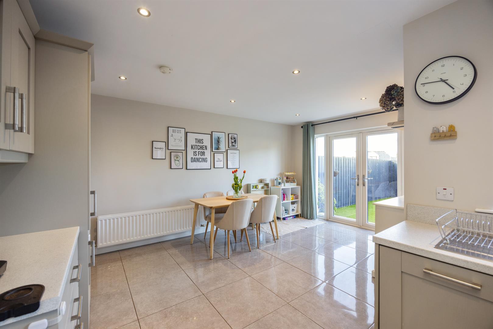 Modern fitted kitchen with range of high and low rise units with integrated stainless steel sink and drainer. Integrated dish washer and fridge/freezer. Electric oven and hob with overhead stainless steel extractor fan. Tiled floor. Space for dining/living. Double patio doors to rear garden. Door to utility room.