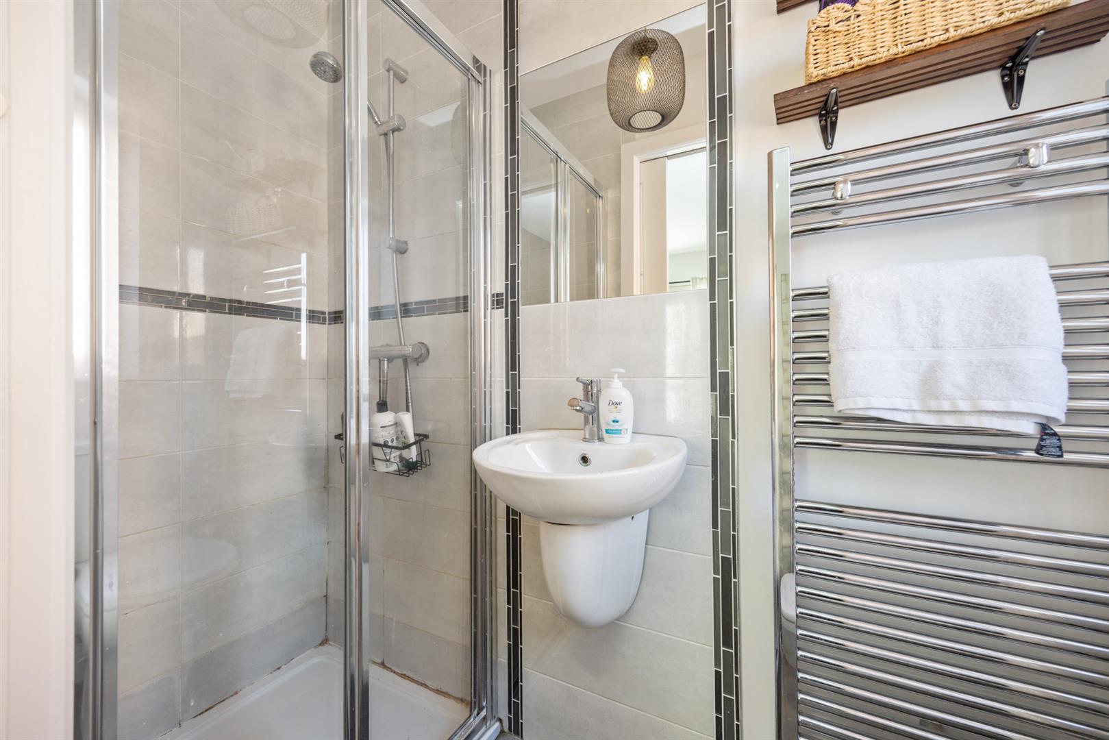 White suite encompassing low flush W/C, wash hand basin and shower. Towel radiator. Tiled walls and floor.