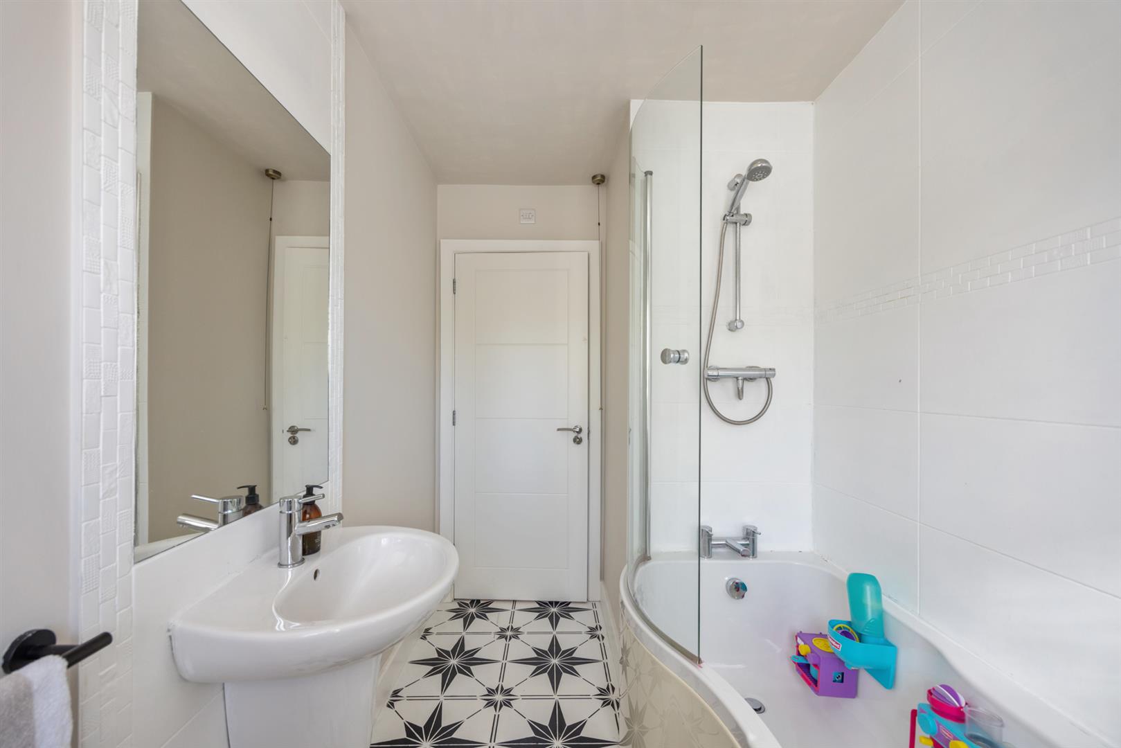White suite encompassing low flush W/C, wash hand basin and bath with overhead shower. Towel radiator. Feature tiled floor and part tiled walls.