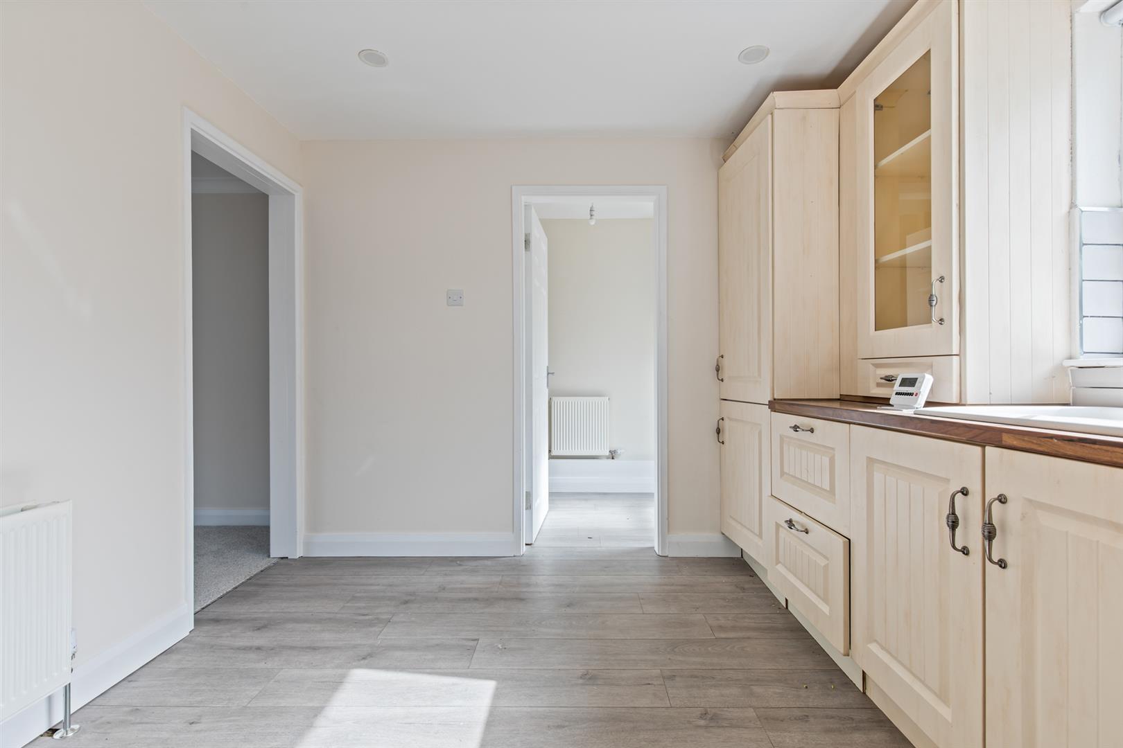 Range of high and low level units, wood laminate worktops, wood laminate flooring, plumbed for washing machine, space for tumble dryer and access to rear garden.
