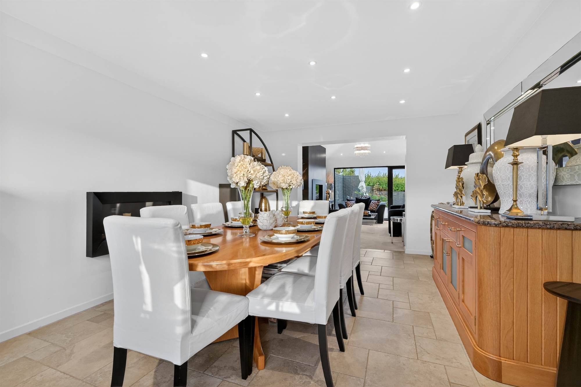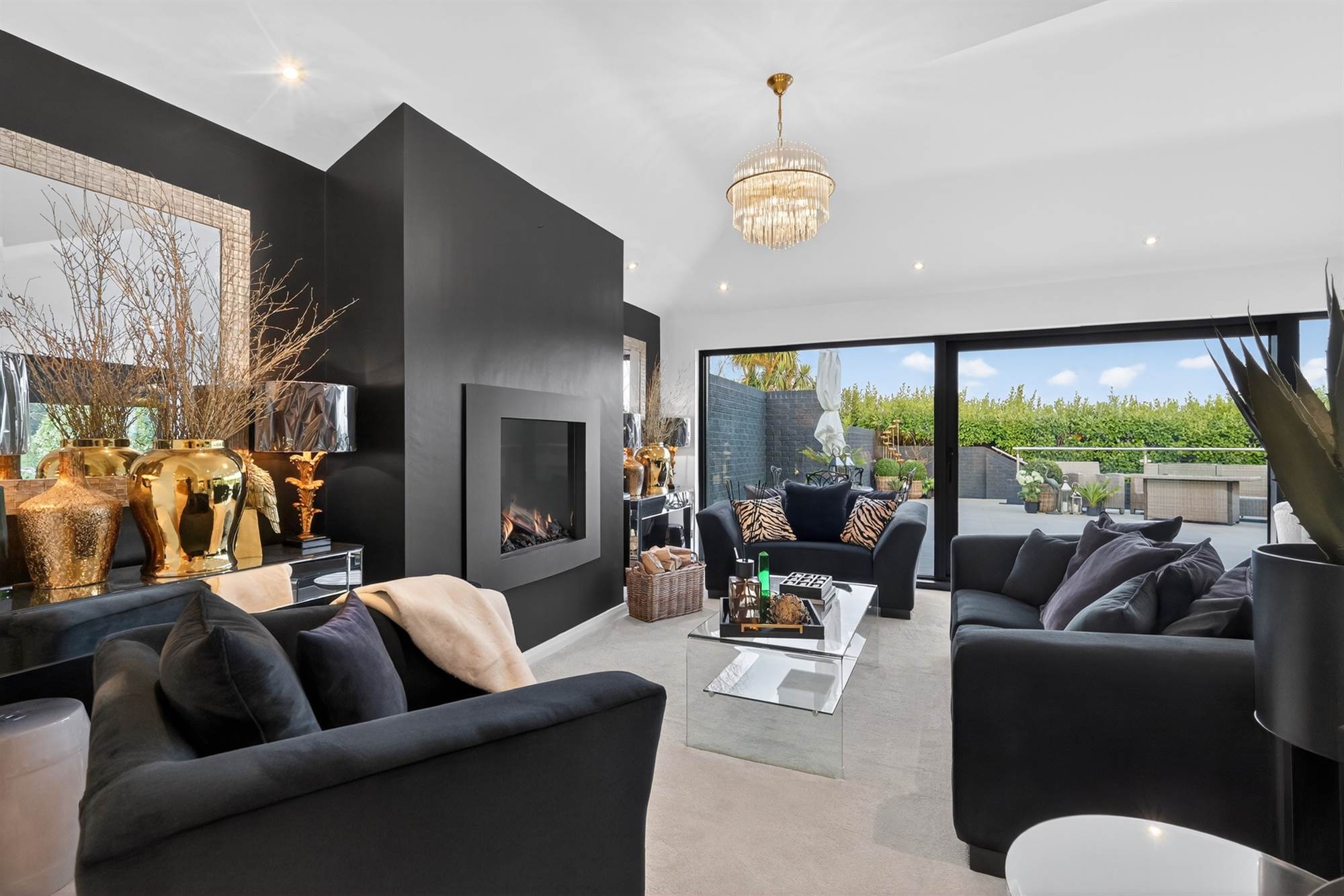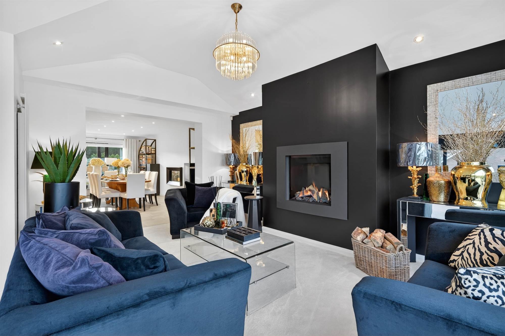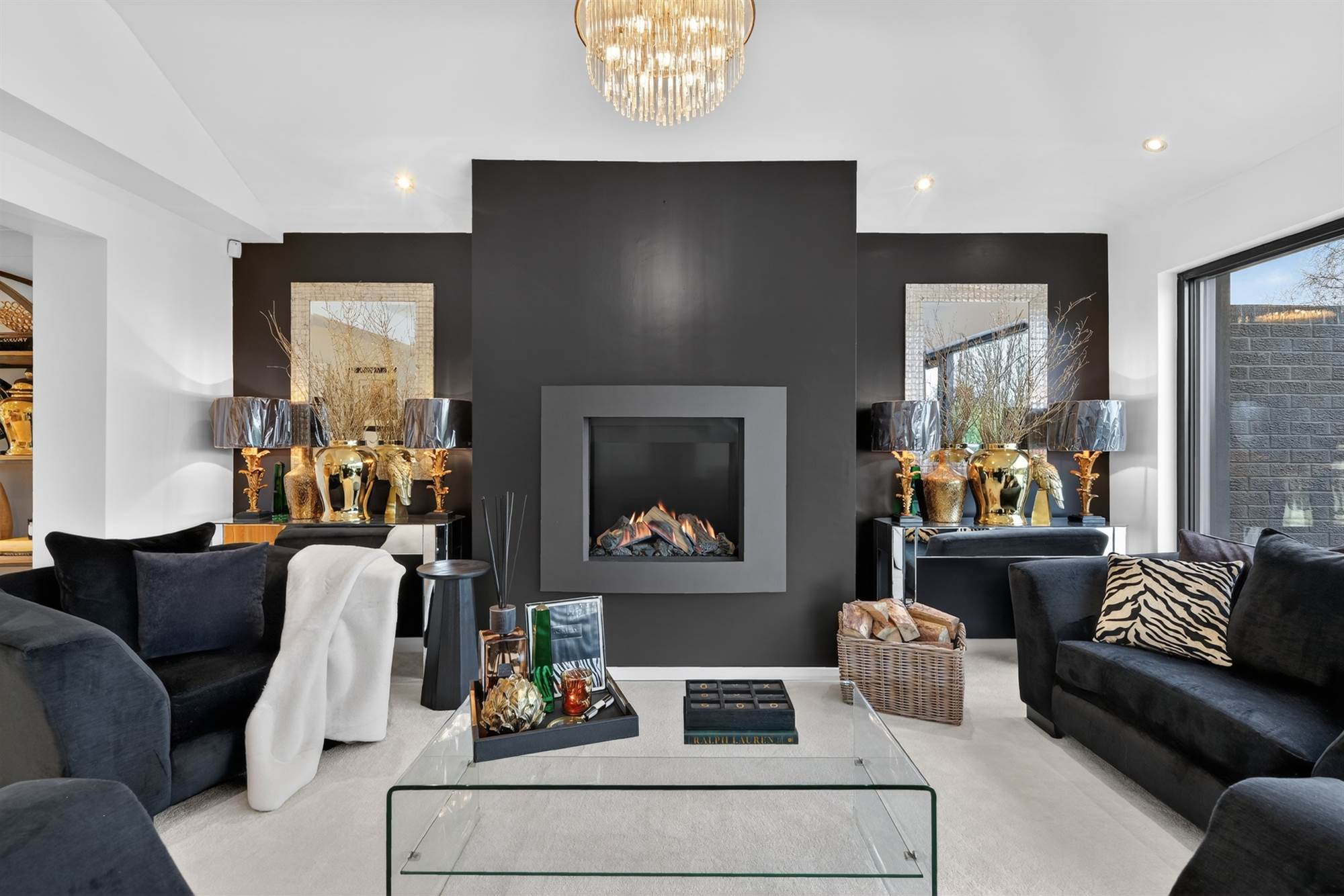 Decorative gas fire, outlook to front and side, low voltage spotlights, feature shelving.