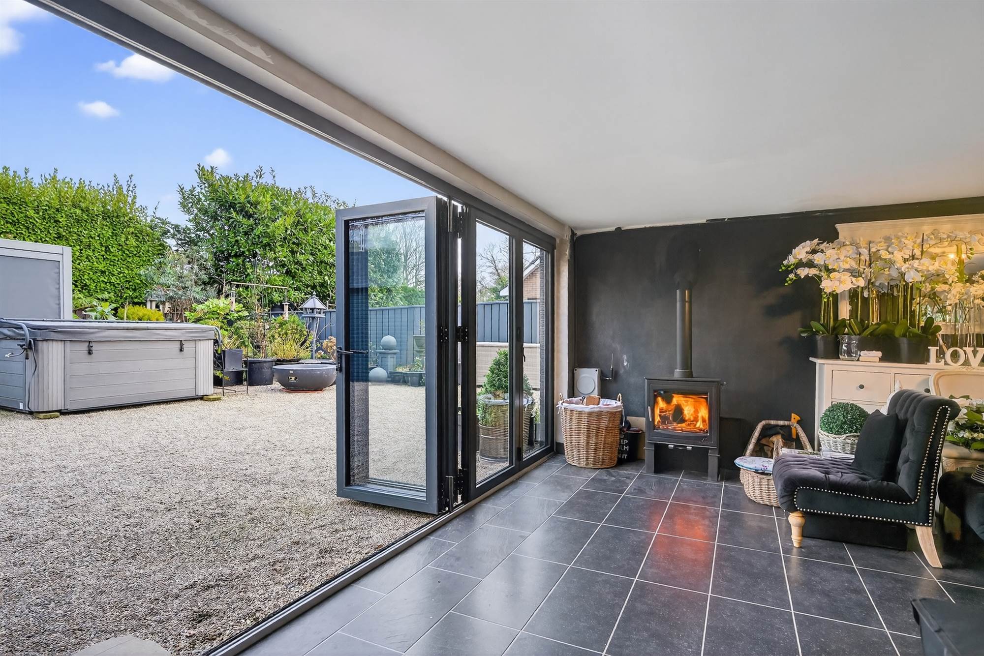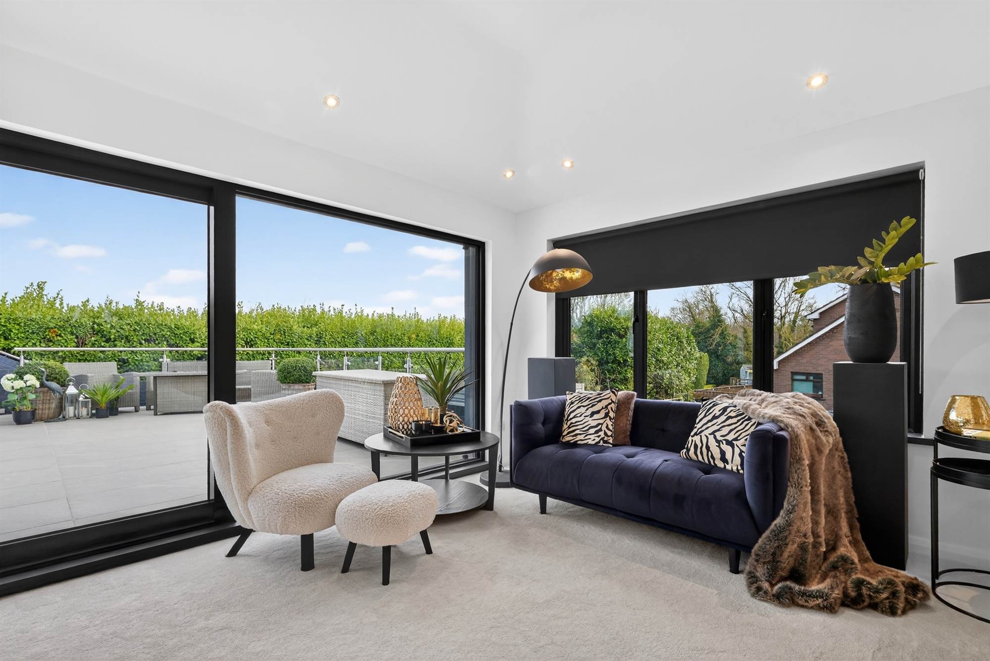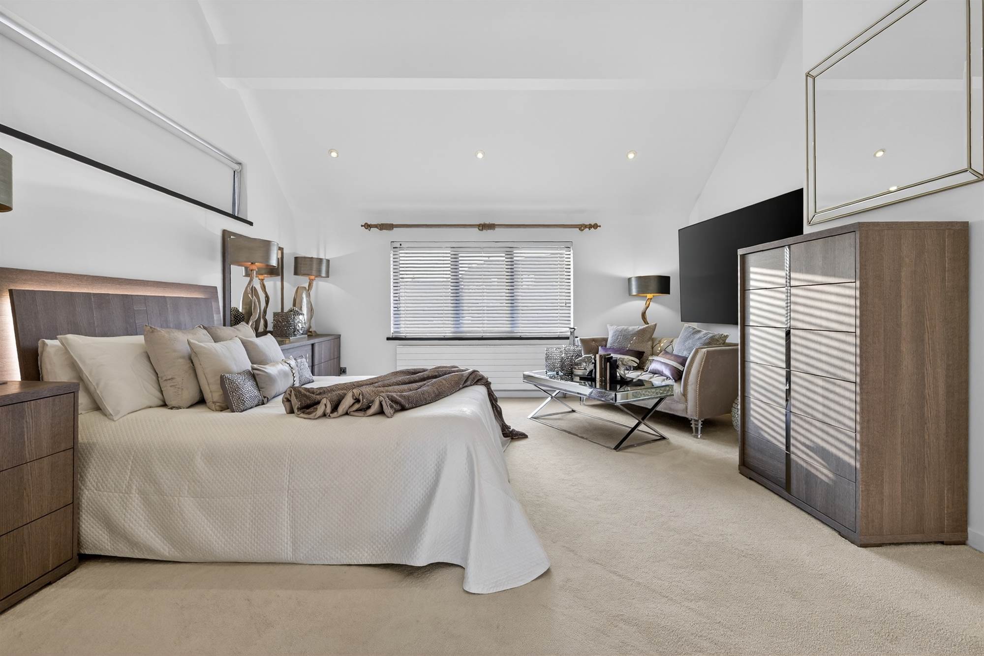 (at widest points). High output remote control gas fire, feature vertical radiator, low voltage spotlights, vaulted ceiling, full height windows and sliding door to sun terrace.