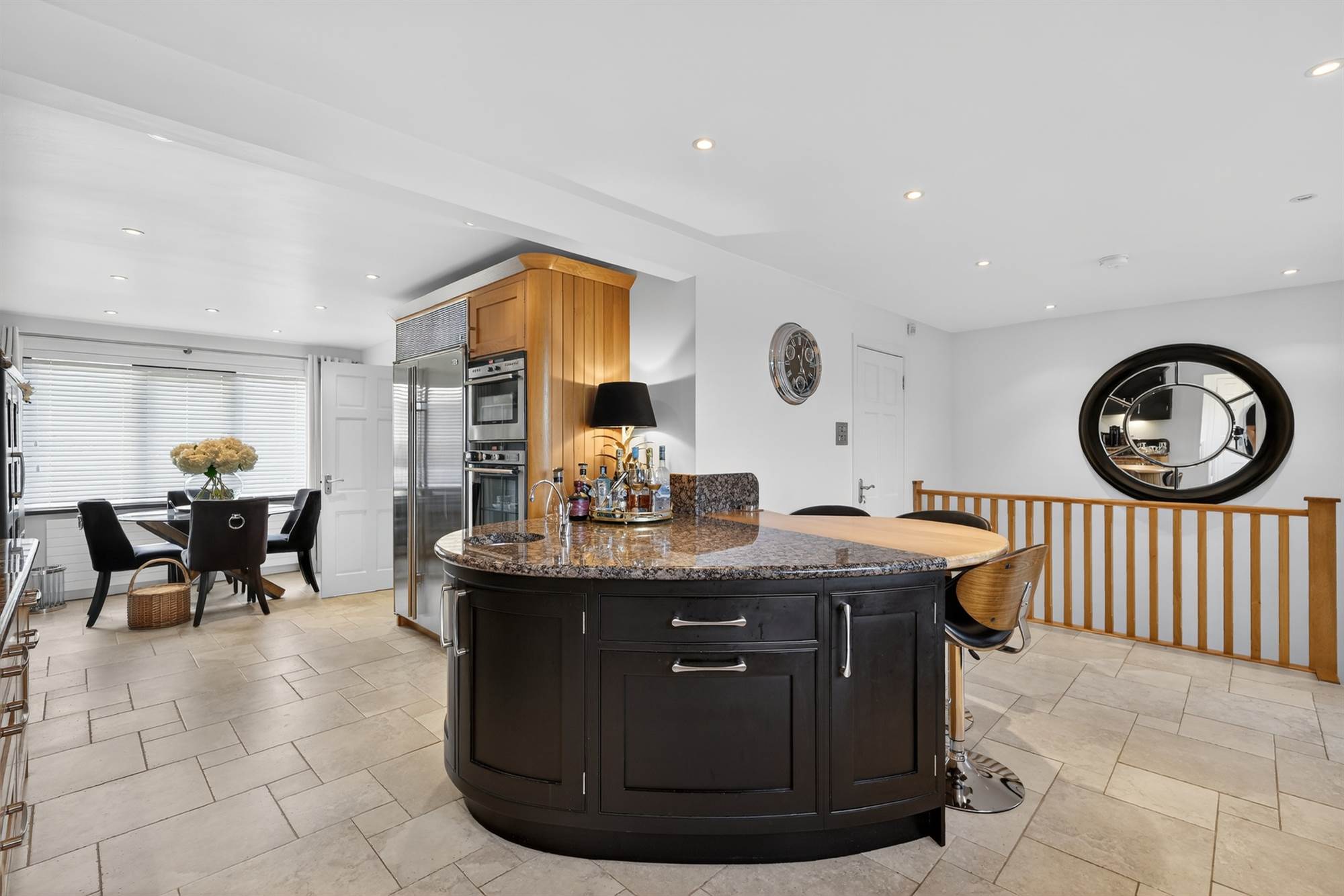 Excellent range of high and low level units, granite worktops, island unit with sink with chrome mixer tap, storage, casual dining area, Franke, Villeroy and Bosch double sink with chrome mixer tap,Siemens electric hob with extractor fan, Siemens double oven with plate warmer, Sub Zero double fridge, integrated dishwasher, plumbed for a wine fridge, ceramic tiled floor, low voltage spotlights. Seating area with access to main hallway, outlook to front, low voltage spotlights. Access to . . .