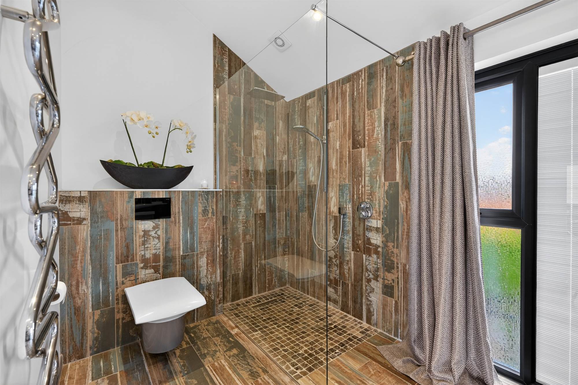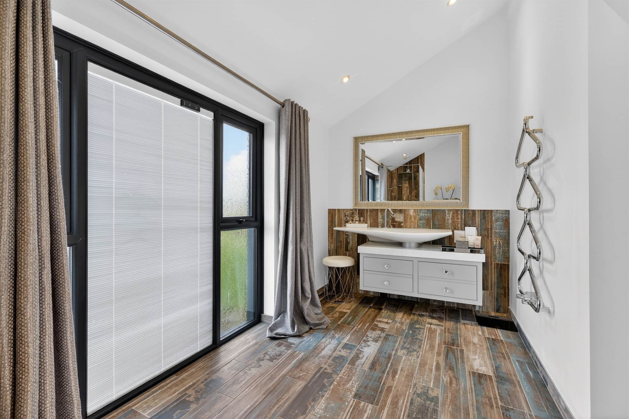 Comprising low flush wc, walk-in shower with overhead shower head and body spray, wash hand basin with chrome mixer tap and storage underneath, two feature heated towel rails, low voltage spotlights, electric blind, outlook to rear, programmable underfloor heating.