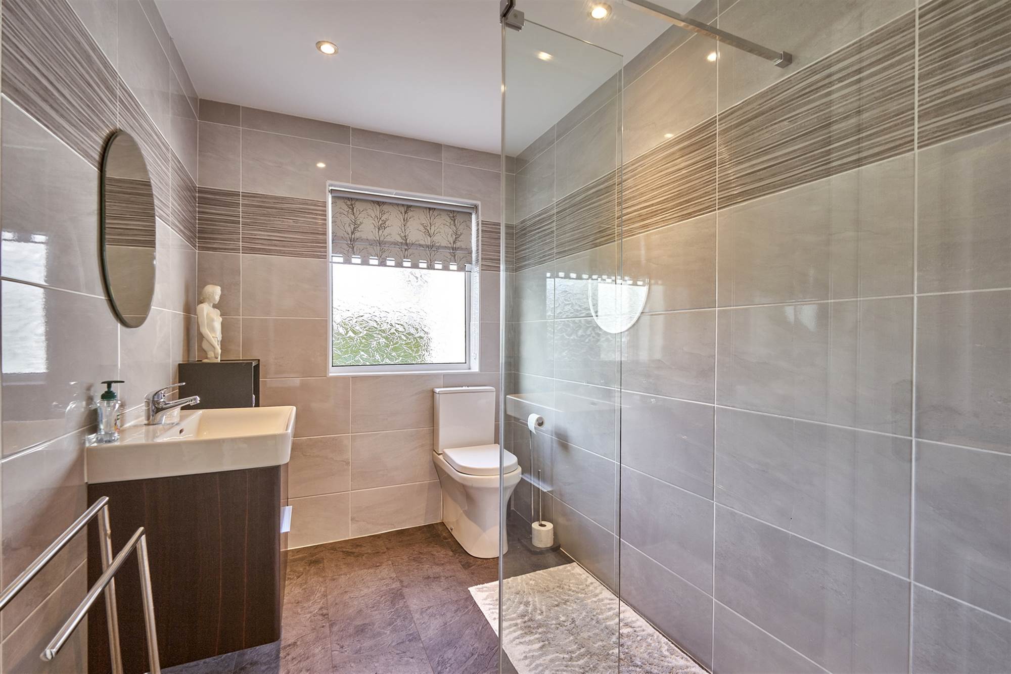 Fully tiled built-in shower cubicle with mains shower unit, wall mounted wash hand basin with mixer tap and low level drawer, fully tiled walls, vinyl flooring, low voltage spotlights, window.