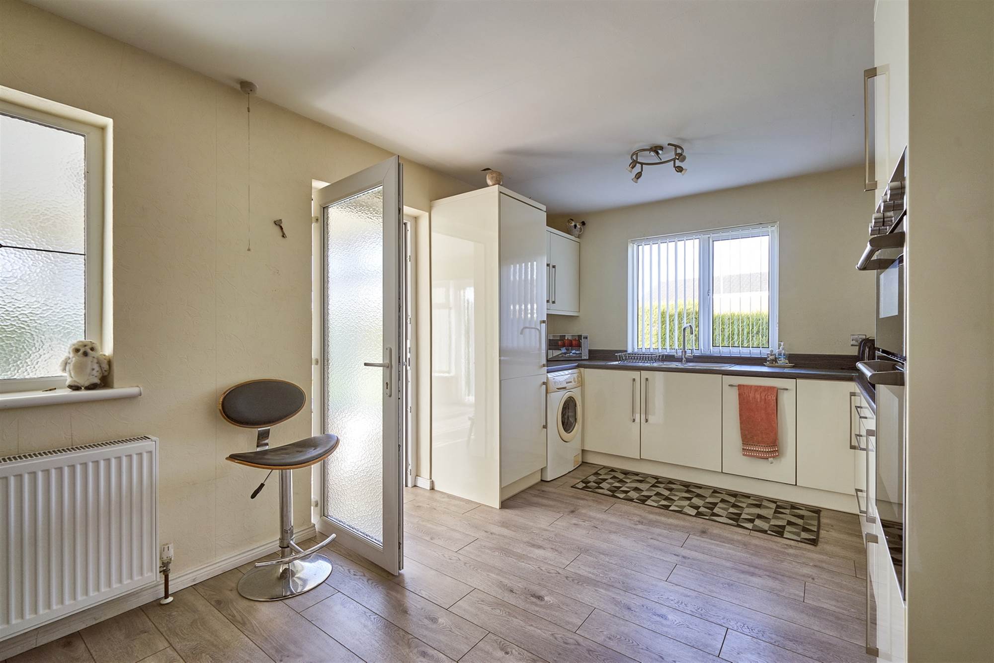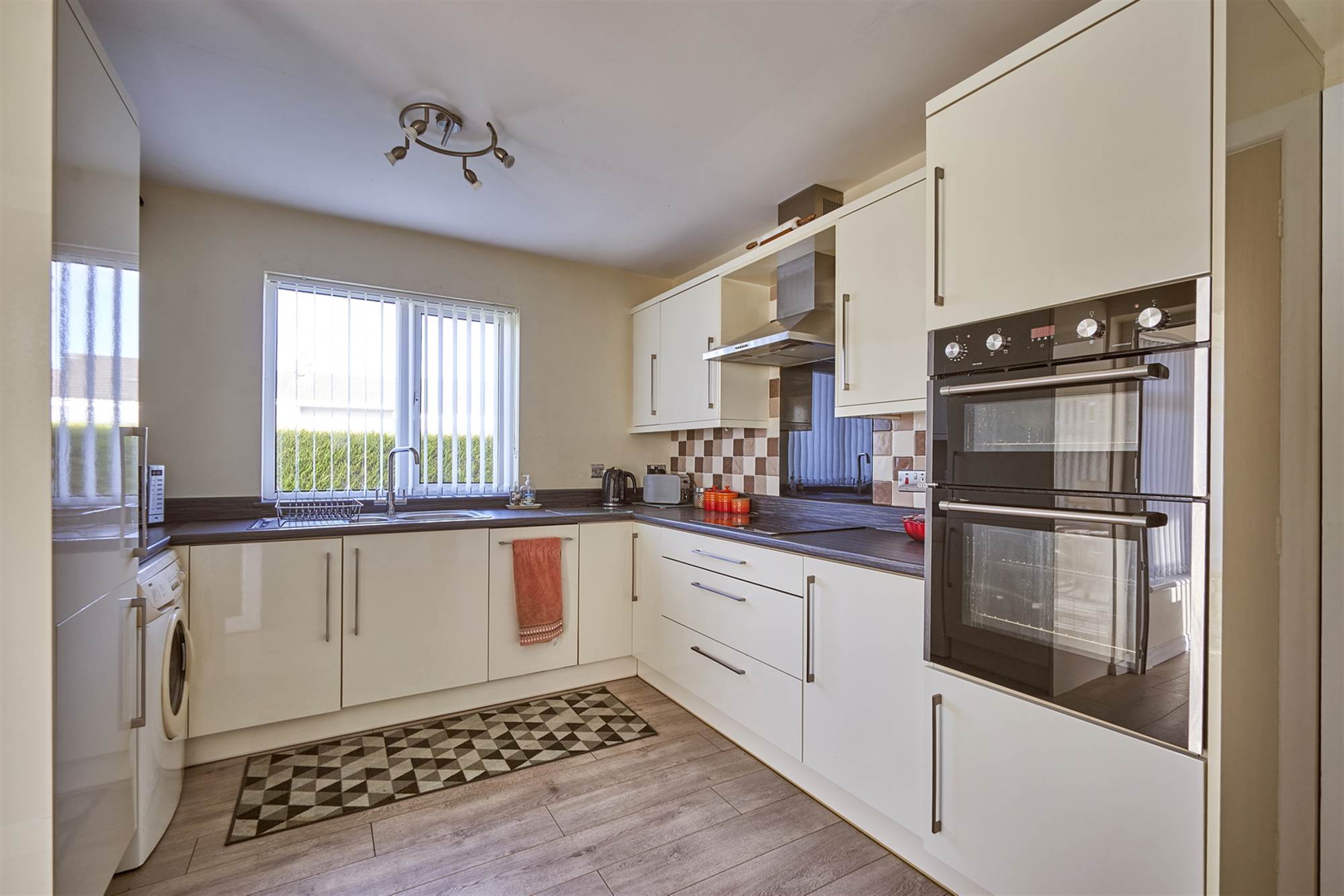 Modern cream gloss kitchen with excellent range of high and low level units, built-in matching dresser, wood block effect worktops, stainless steel 1.5 bowl sink with drainer, built-in four ring ceramic hob, stainless steel extractor fan, builot-in eye level electric oven and grill, built-in fridge freezer, plumbed for washing machine. Door to . . .